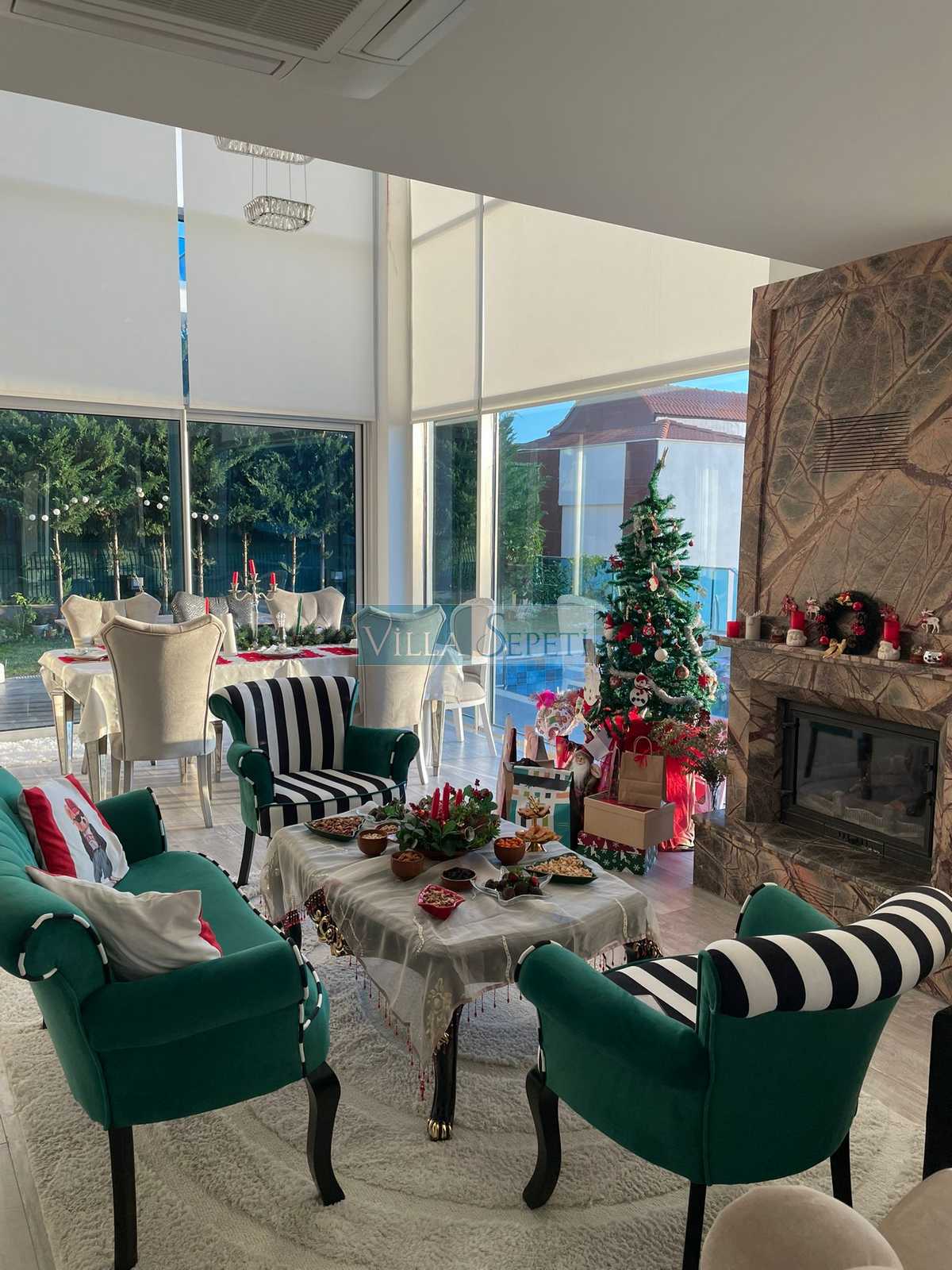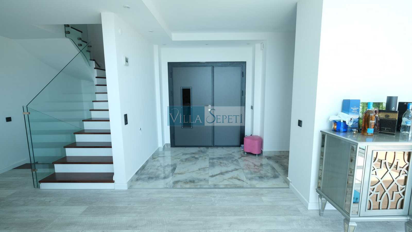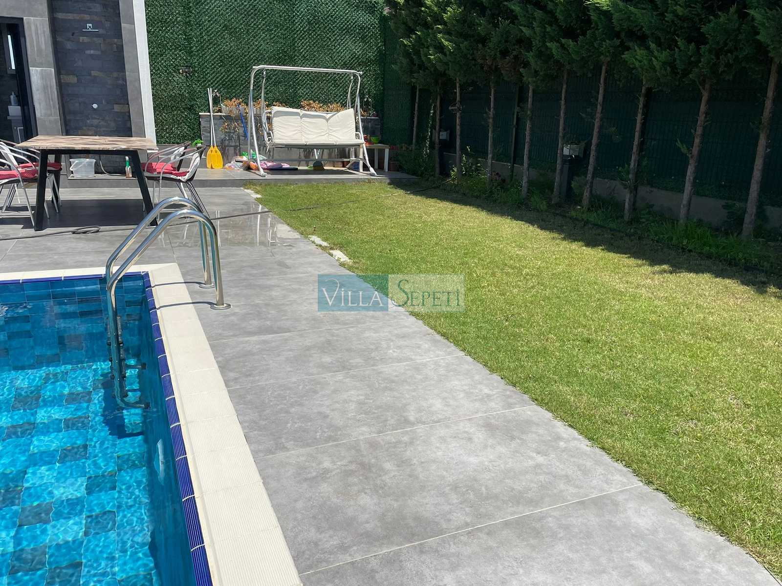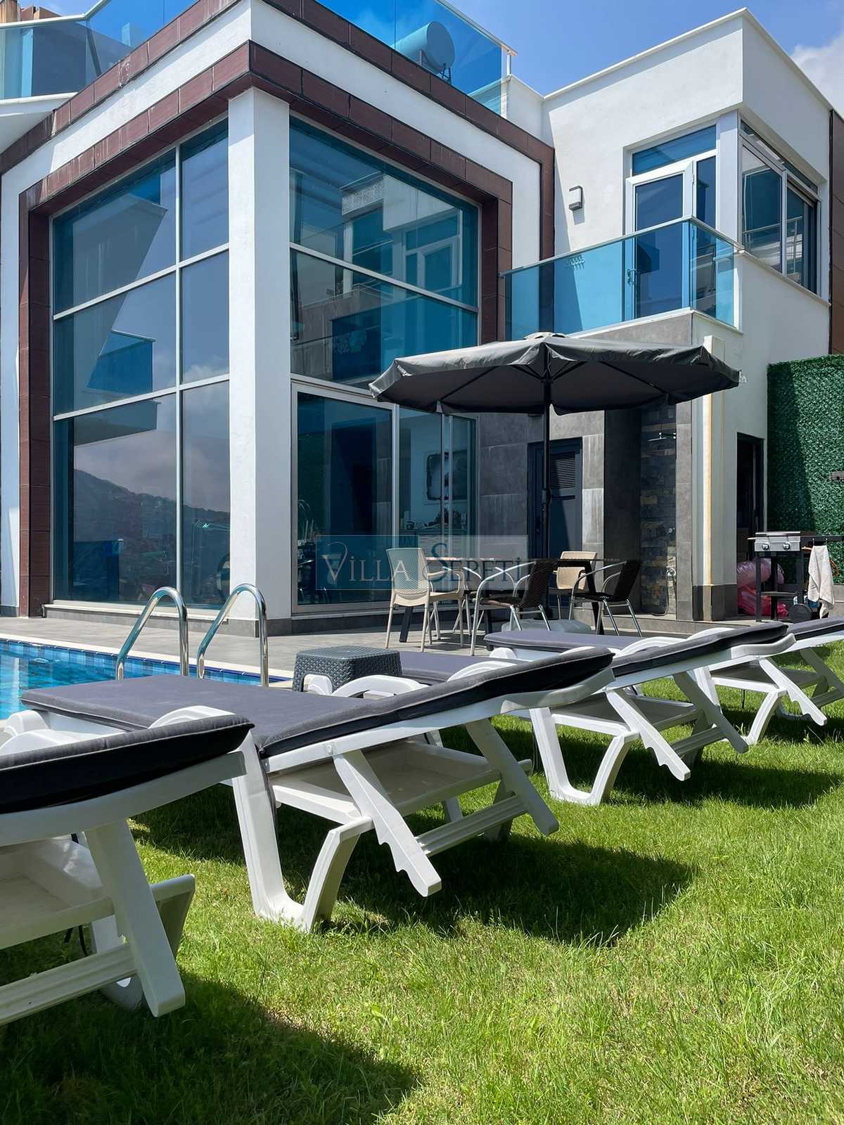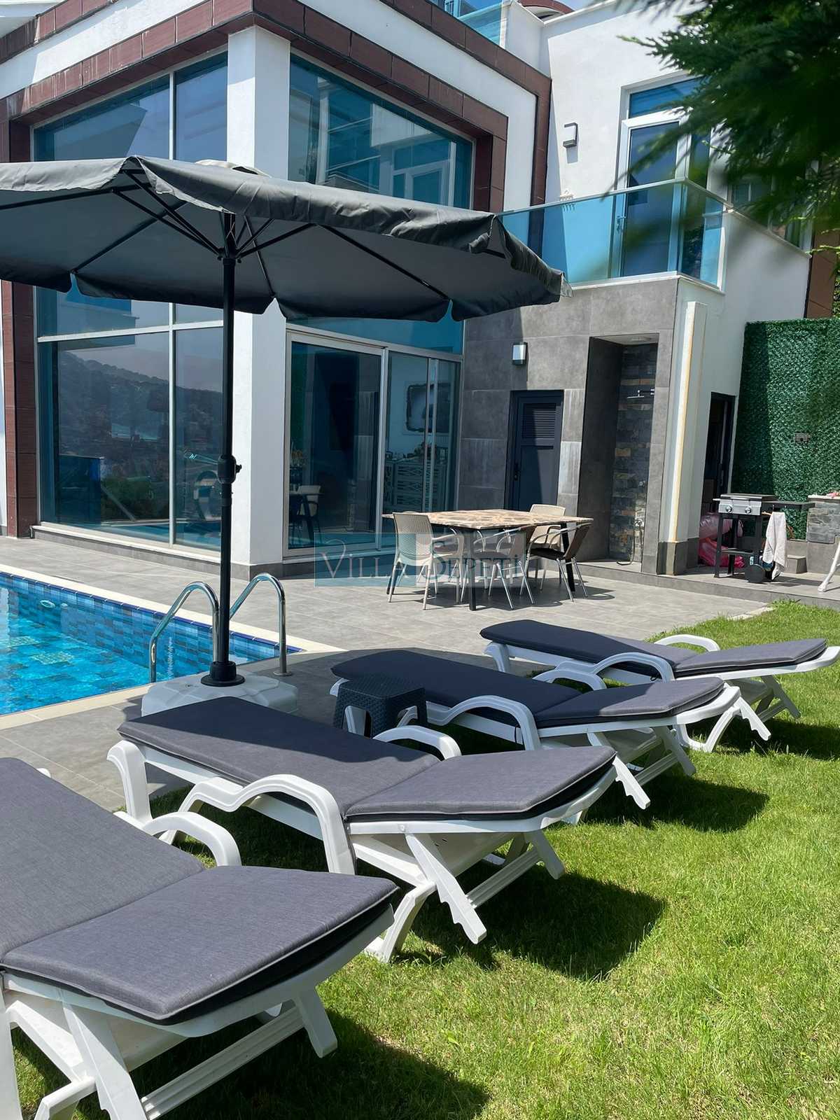 Villamızın zemin katında bir adet çift kişilik yatağa sahip, klimalı bir yatak odası, banyo, çamaşır odası, mutfak ve oturma grubu bulunan bir salon mevcuttur. Giriş katında ise amerikan mutfak, oturma grubu, TV, klima, WC, şömine yer almakta olup ve bu kattan bahçeye ve havuza giriş yapılmaktadır. Üst katta üç yatak odasından ikisi çift kişilik yatak ve klimalı olup, bir tanesi tek kişilik yataklı, klimalı ve ebeveyn banyoludur. Ayrıca bu katta bir adet banyo bulunmaktadır. En üst katta ise bir adet çift kişilik yatak, klima ve ebeveyn banyolu yatak odası ve terası yer almaktadır.
