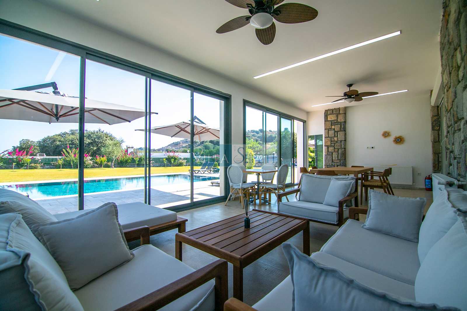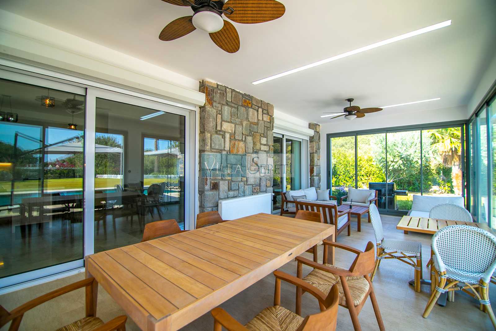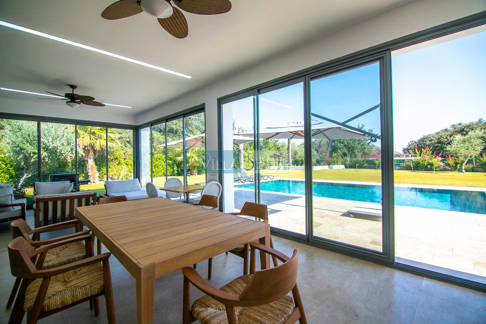 Villa Miju Gümüşlük 3, özellikle çok geniş ve yemyeşil bahçesiyle öne çıkmaktadır. Özenle düzenlenmiş peyzajı ve doğal güzellikleriyle çevrili bu bahçe, hem dinlenmek hem de sevdiklerinizle keyifli vakit geçirmek için ferah bir alan sunar. Villanın bahçesinde yer alan kapalı veranda alanı, yazın sıcağından korunarak serin bir ortamda vakit geçirme imkânı sağlamaktadır. Burada bulunan rahat oturma grubu, geniş yemek masası ve tavan vantilatörü, günün her saati keyifle vakit geçirebileceğiniz bir ortam yaratır.