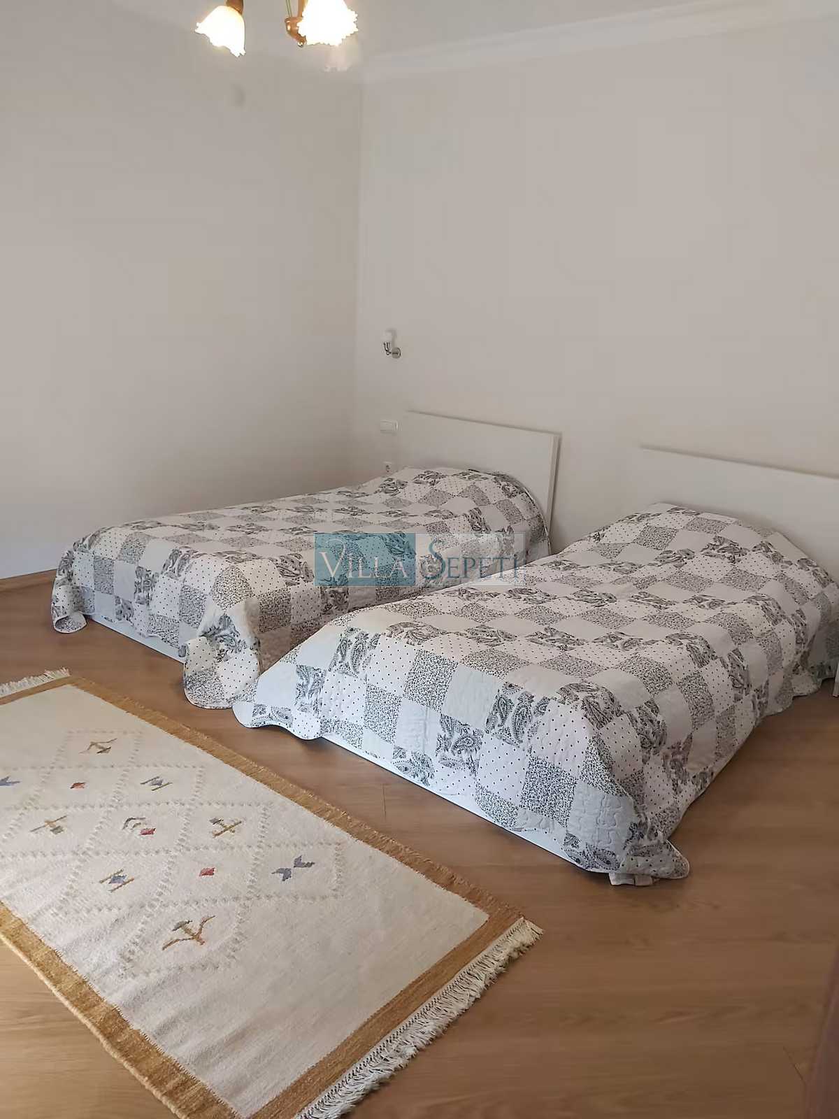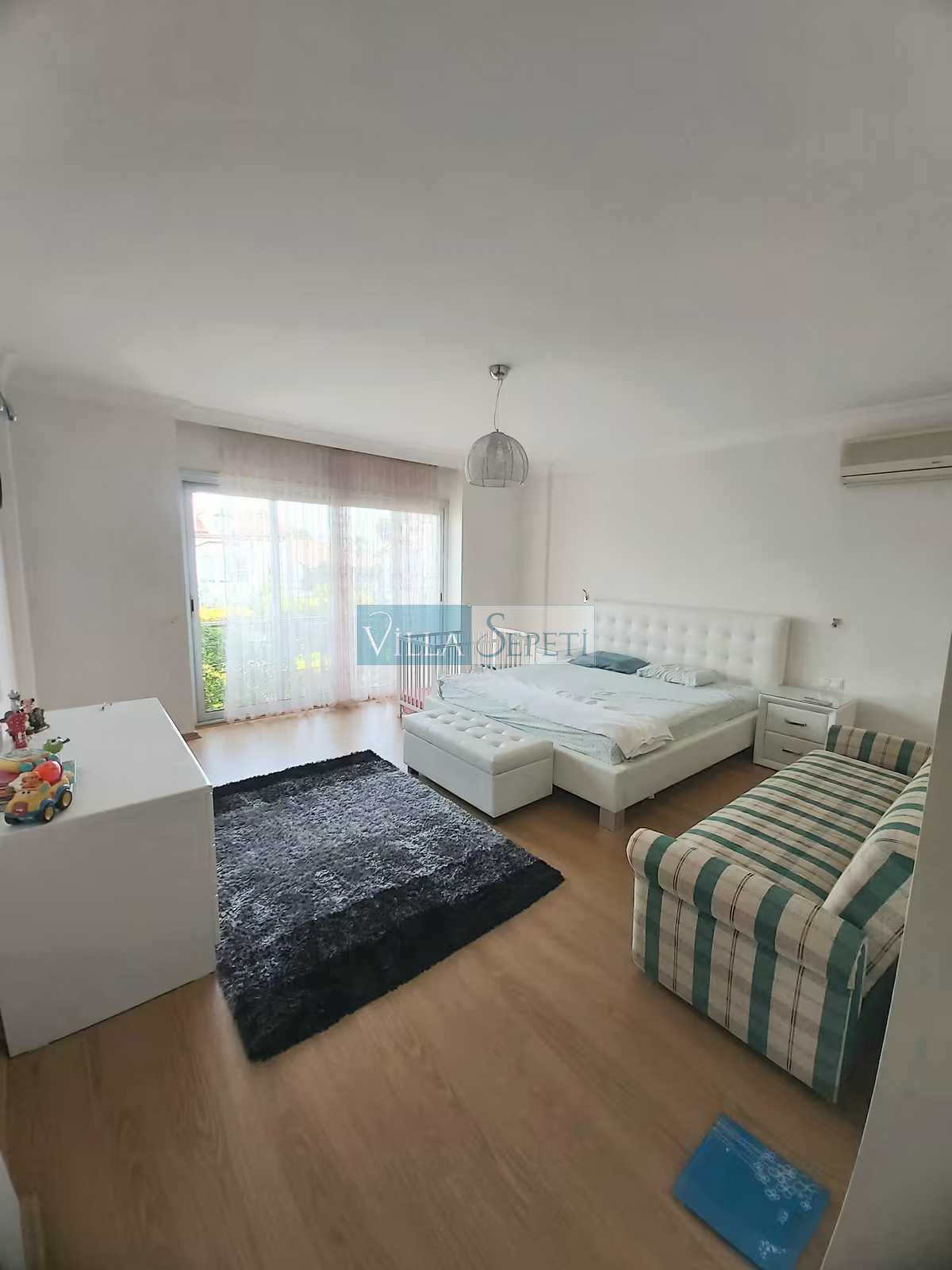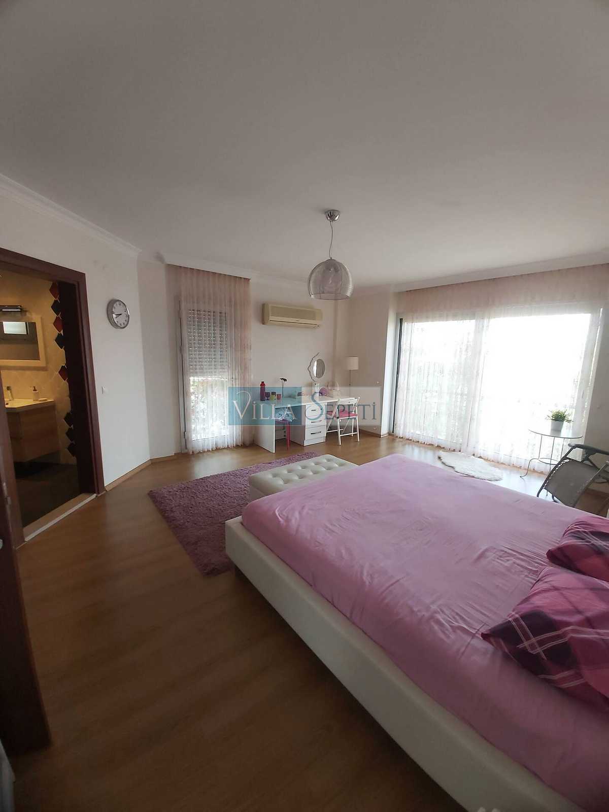 Villamızın içerisinde 4 adet yatak odası ve 4 adet banyo mevcuttur. Bir çift kişilik yatağın bulunduğu yatak odası giriş katta yer alırken, diğer üç adet yatak odası üst katta konumlanmaktadır. Üst katta yer alan yatak odalarının bir tanesi suit oda olmakta olup, oda içinden açılan kapı iki tek kişilik yatağın bulunduğu bölüme açılmaktadır. Diğer yatak odasında bir çift kişilik yatak, wc-duş ve klima, bir diğer yatak odasında ise iki ayrı tek kişilik yatak ve wc-duş mevcuttur. Yatak odalarının tümü ebeveyn banyoludur. Villamızın giriş katında ise açık mutfak, salon TV ve klima mevcuttur.