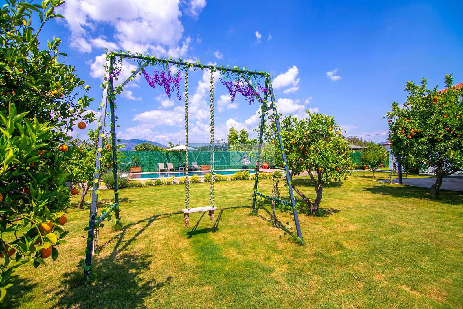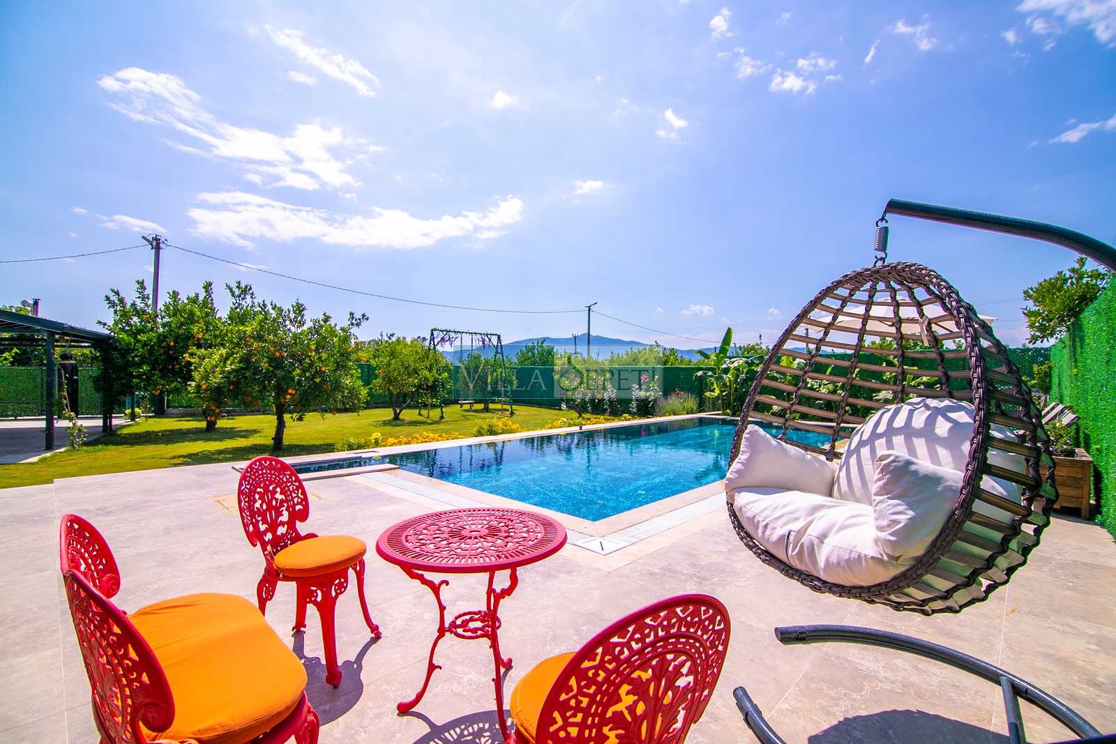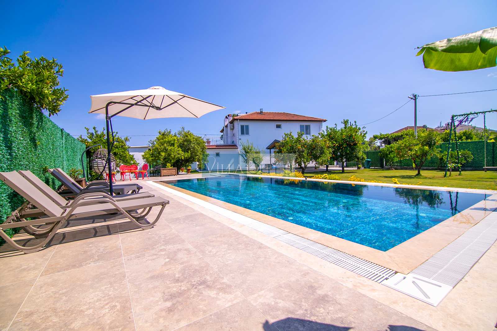 Villa Esterdis, geniş ve yemyeşil bahçe alanı ve portakal ağaçları ile doğanın sıcaklığı ve huzuruyla sarılı bir kaçış sunmaktadır. Havuzun tam korunaklı olması size özel bir gizlilik ve güvenlik sağlarken, bahçe alanında bulunan oturma grubu keyifli vakit geçirmeniz için düşünülmüştür. Akşamın keyfini hamakta çıkararak günün yorgunluğunu atabilirsiniz.