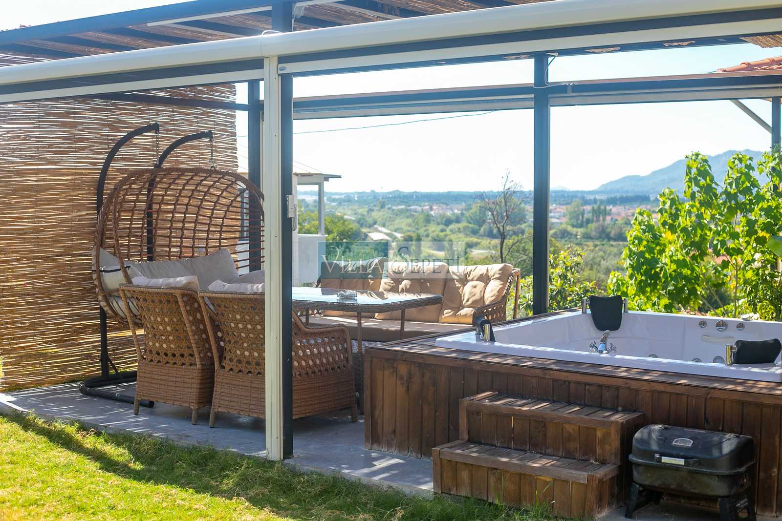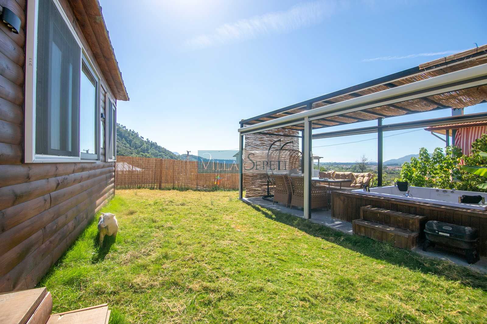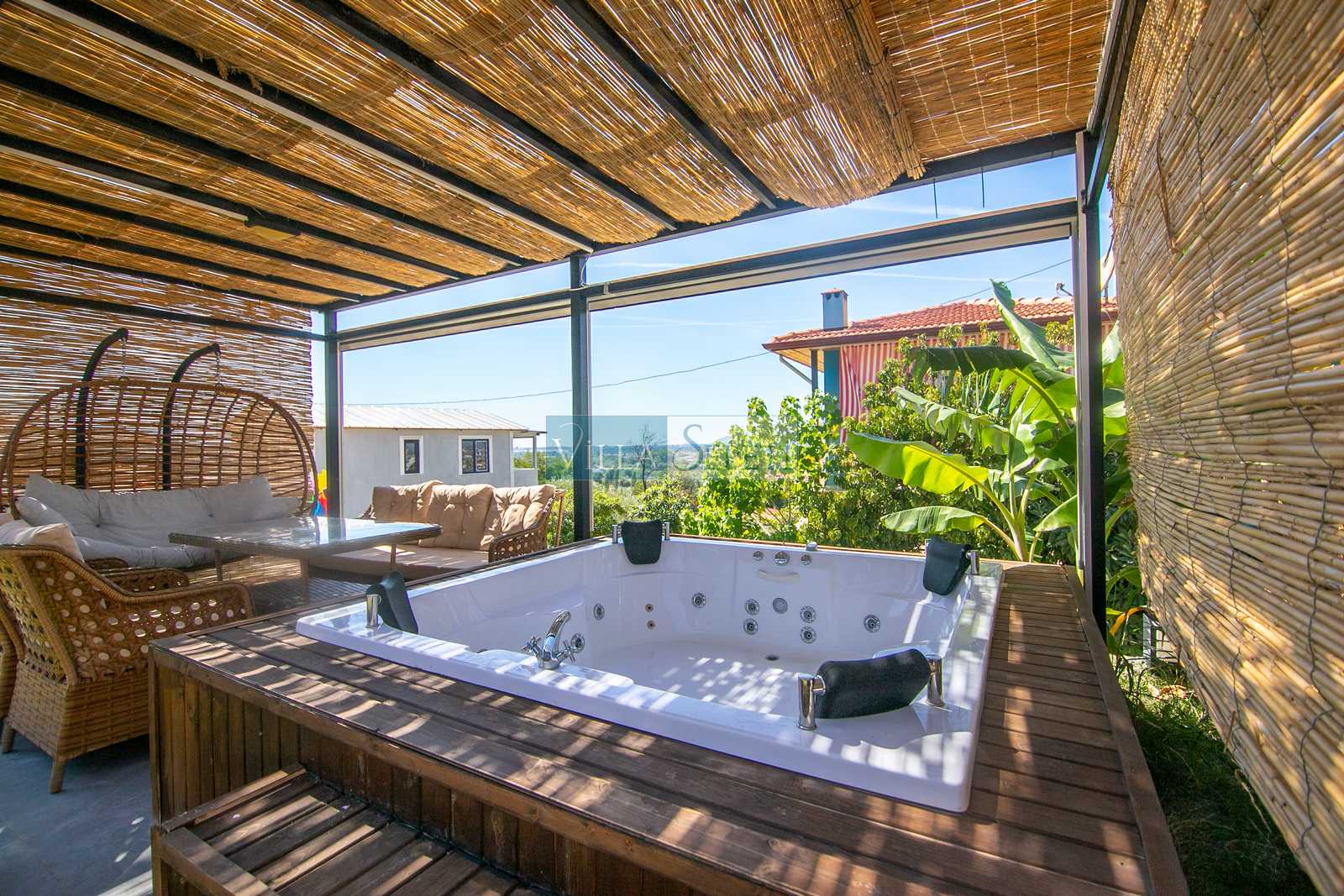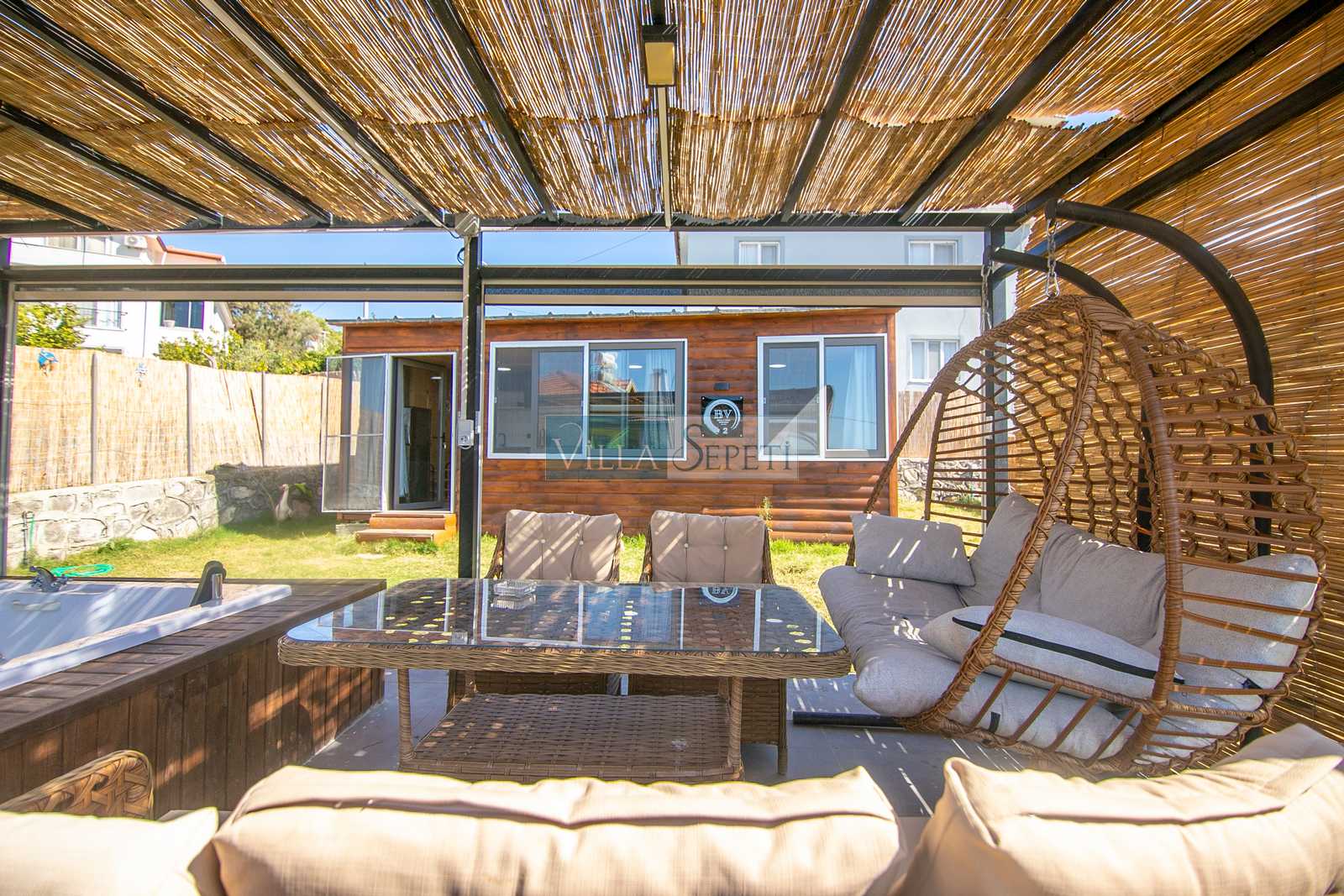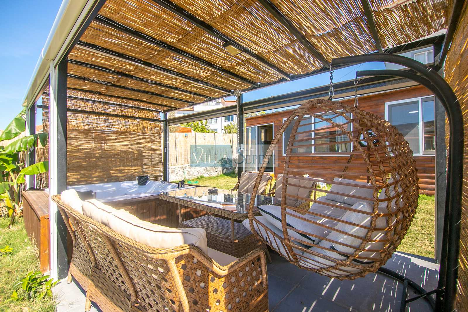 Misafirlerimizin keyifli vakit geçirmeleri için geniş ve yeşil bahçe alanına sahip olan villamızın bahçesi içerisinde 4 kişilik jakuzi bulunmaktadır. Ayrıca yine bahçe alanı içerisinde iki kişilik salıncak ve oturma grubu yer almaktadır. Misafirlerimiz dilerse hem veranda alanında hem de jakuzi de bulunan elektrikli perdeleri kullanarak daha fazla mahremiyet sağlayabilmektedir.