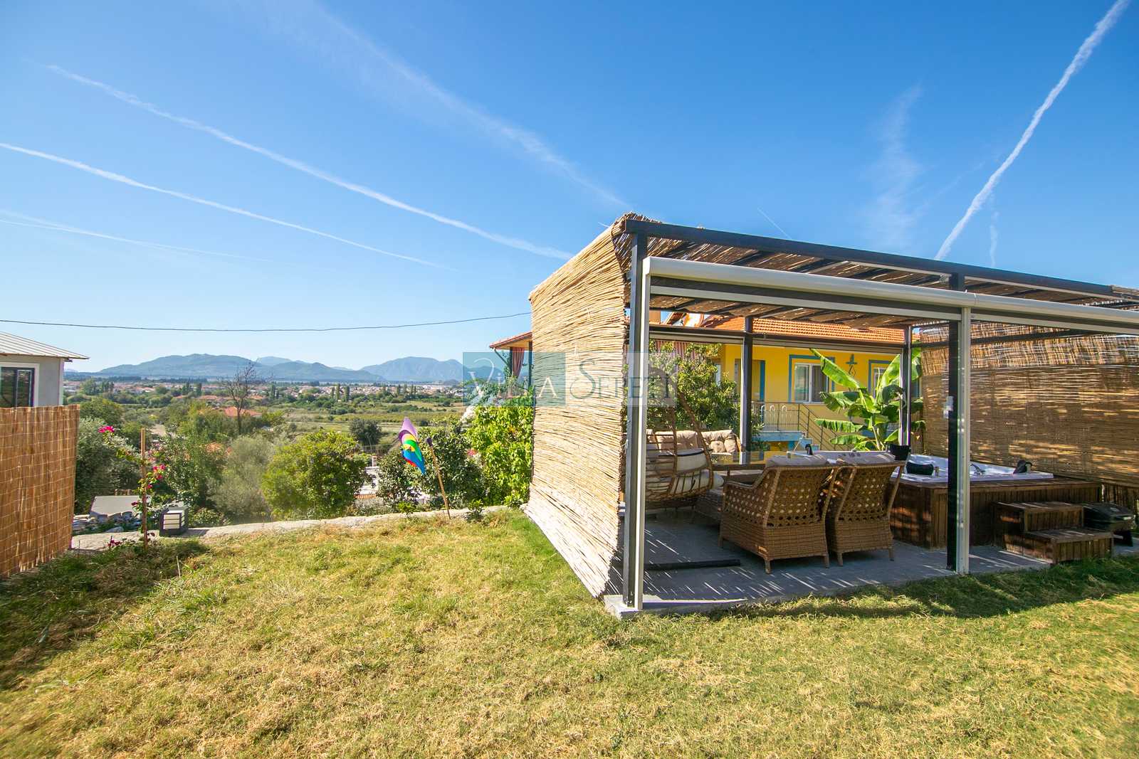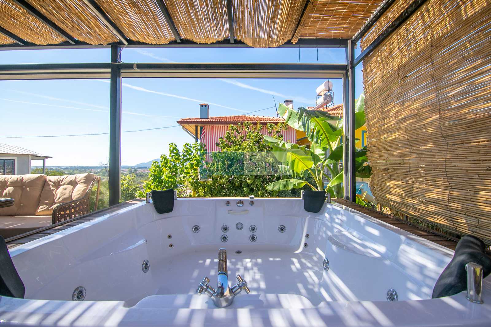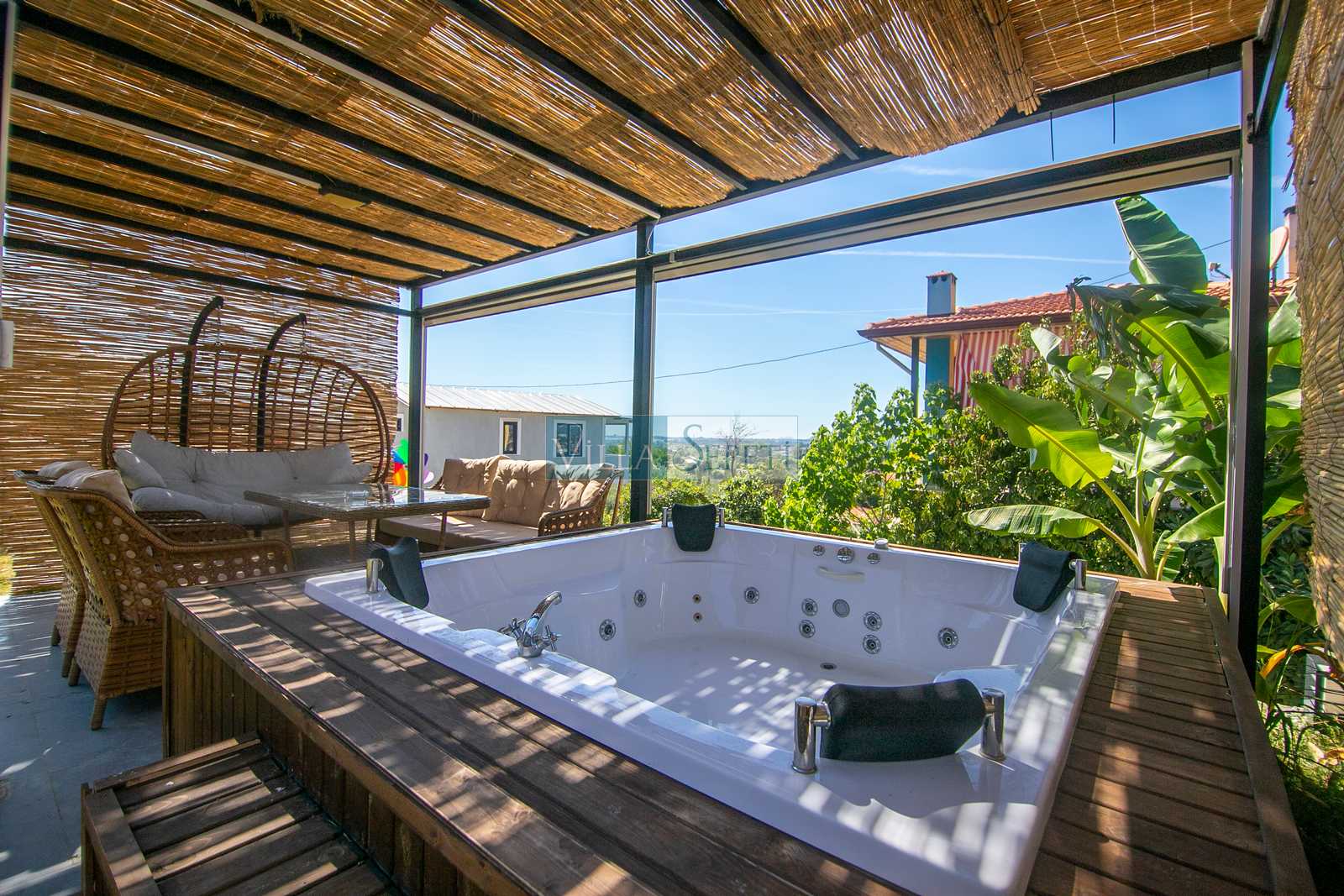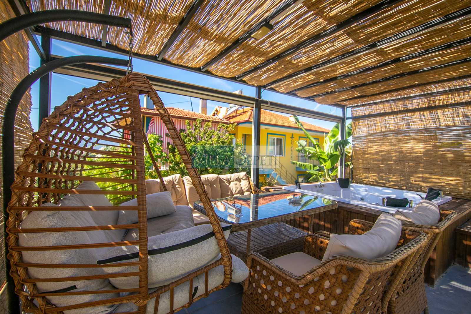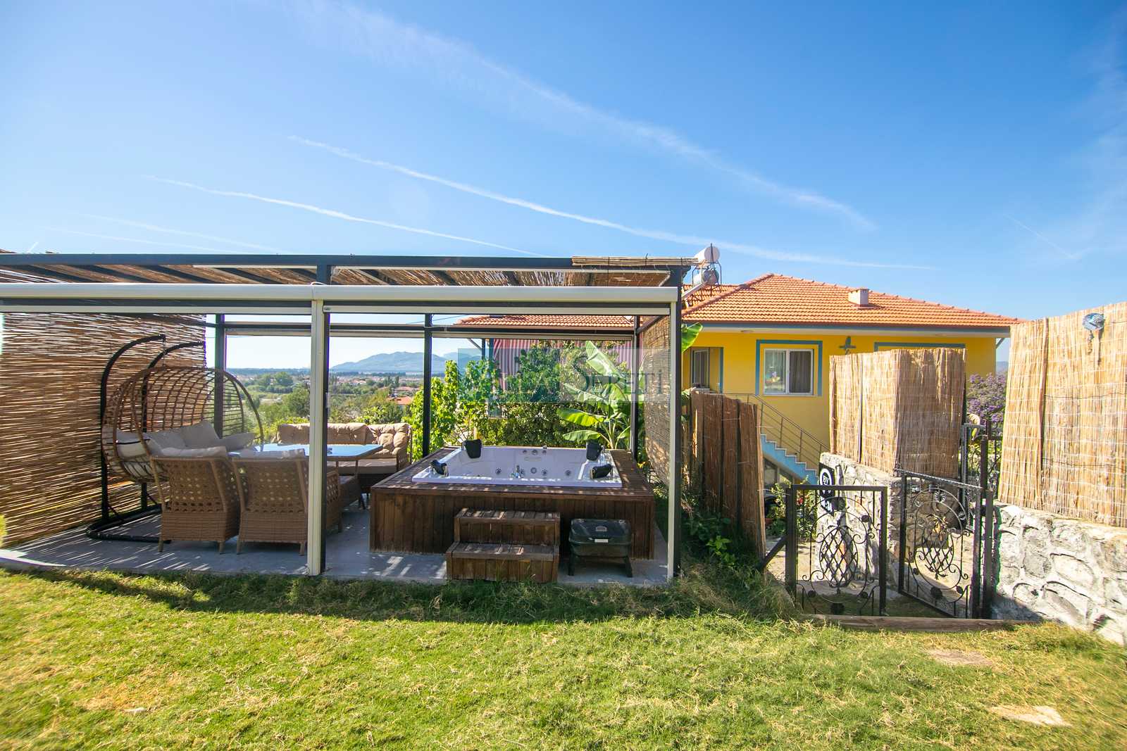 Misafirlerimizin keyifli vakit geçirmeleri için geniş ve yeşil bahçe alanına sahip olan villamızın bahçesi içerisinde 4 kişilik jakuzi bulunmaktadır. Ayrıca yine bahçe alanı içerisinde iki kişilik salıncak ve oturma grubu yer almaktadır. Misafirlerimiz dilerse hem veranda alanında hem de jakuzi de bulunan elektrikli perdeleri kullanarak daha fazla mahremiyet sağlayabilmektedir.