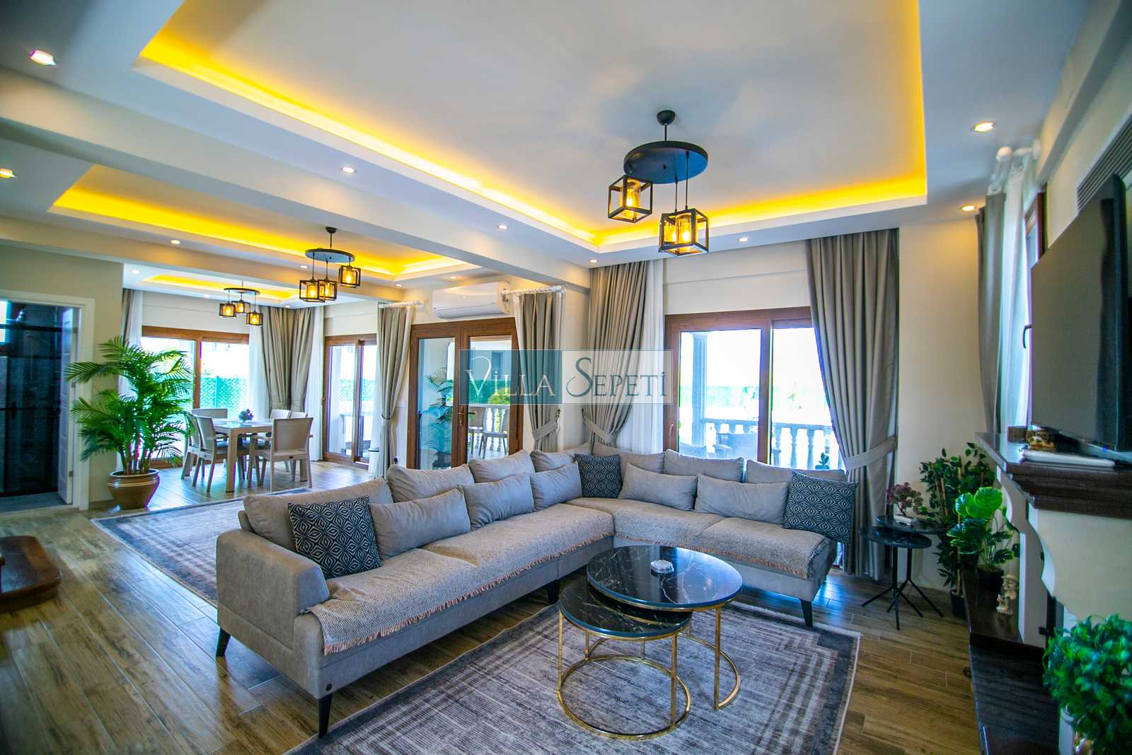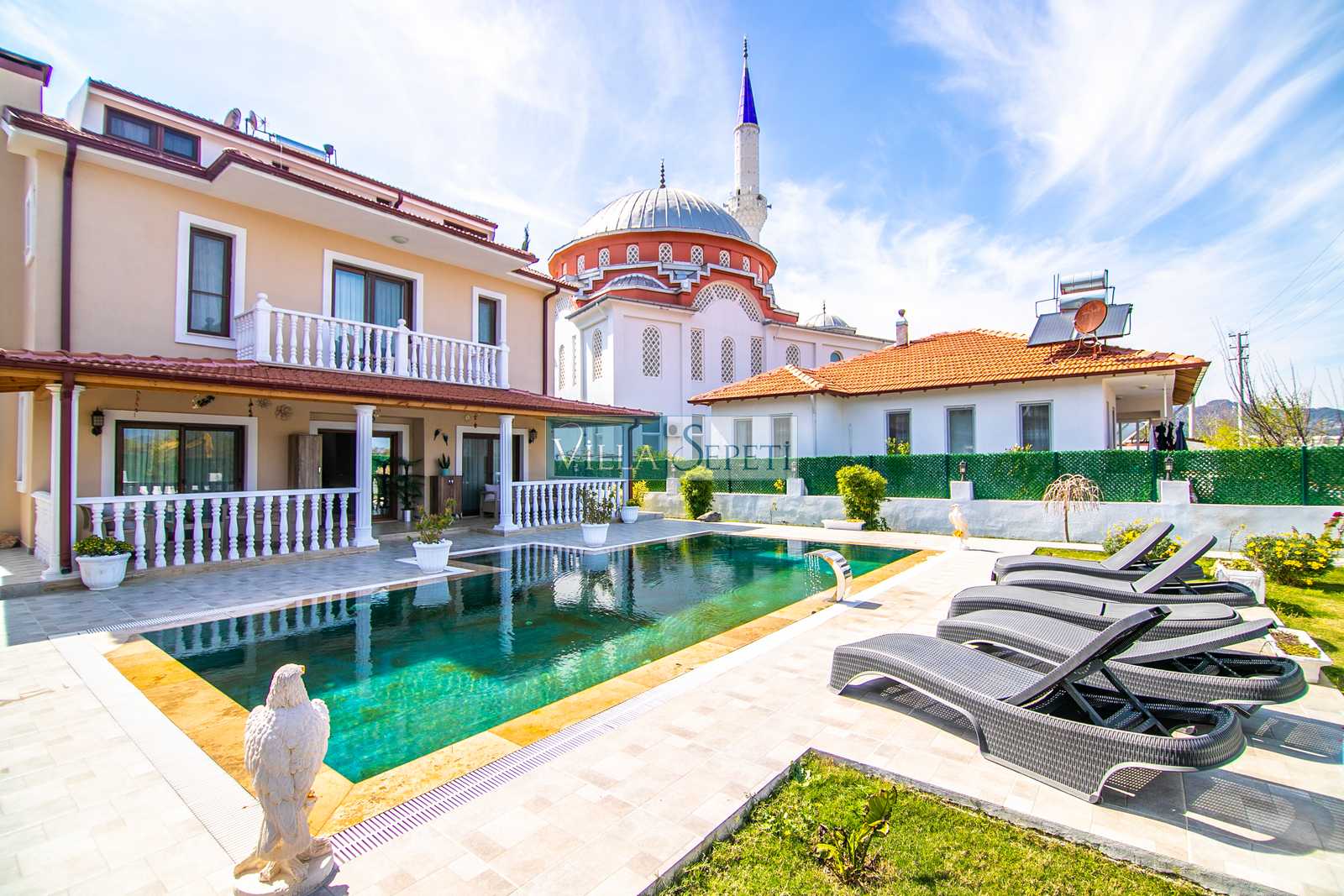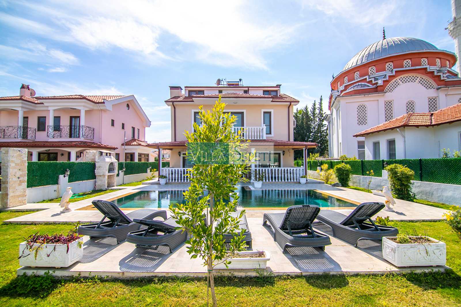 Lüks bir şekilde tasarlanan villamız, bahçesinde geniş ve yemyeşil alanın bulunması ile çocuklu aileler ve kalabalık gruplar için uygundur.