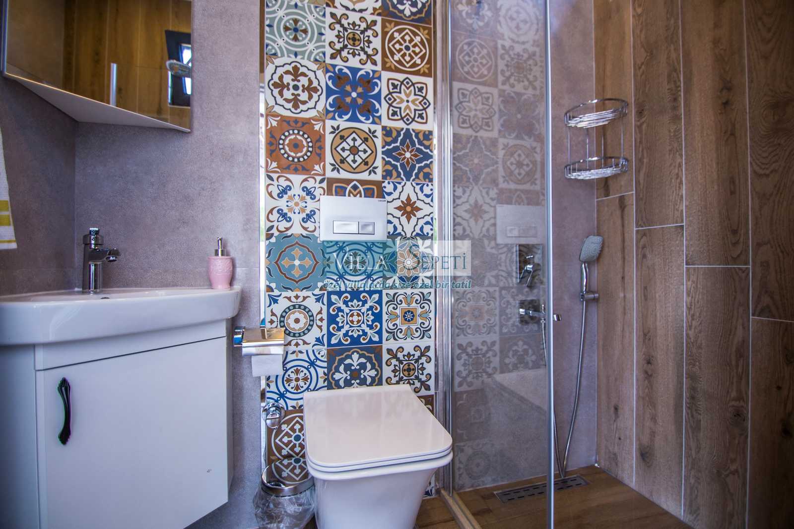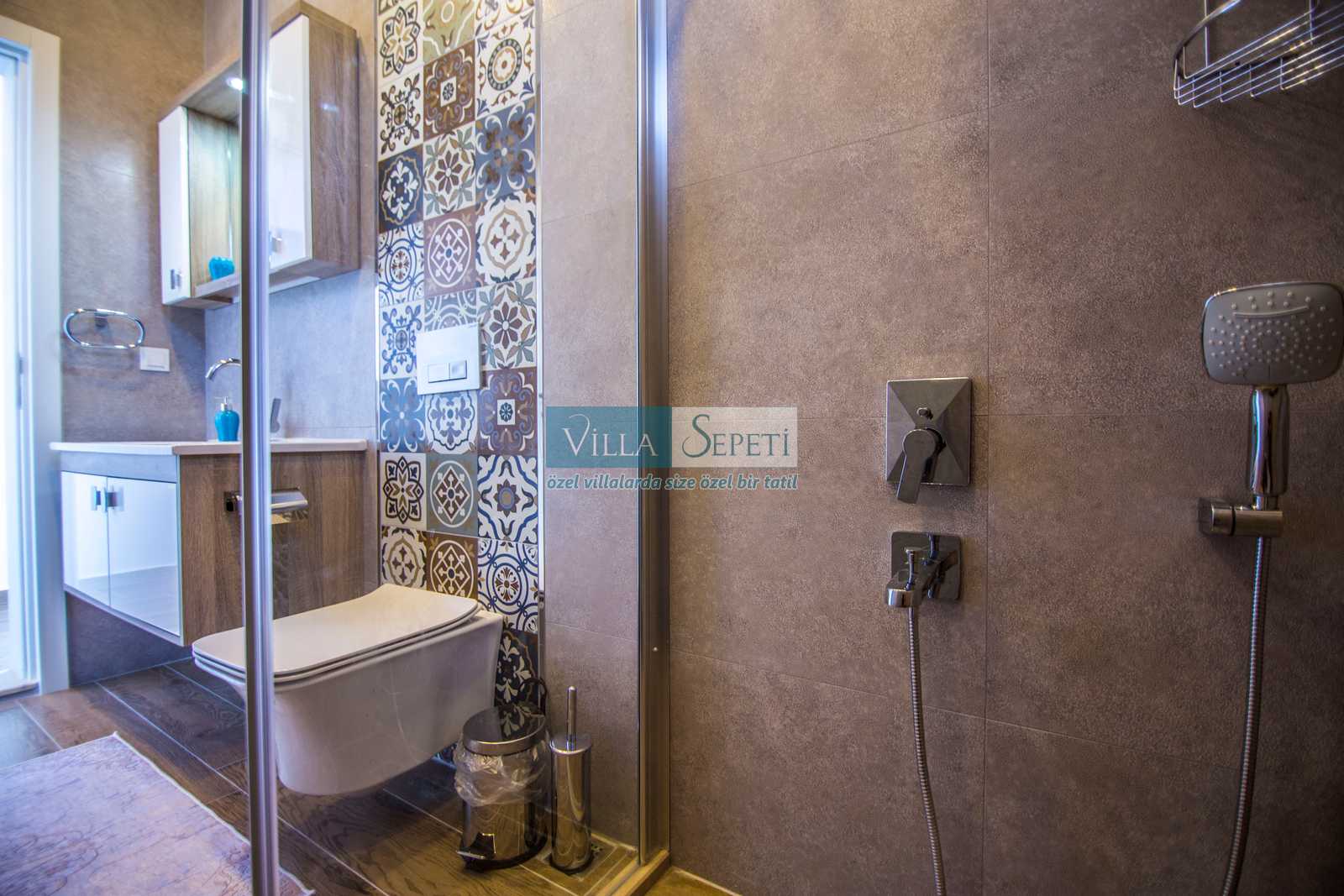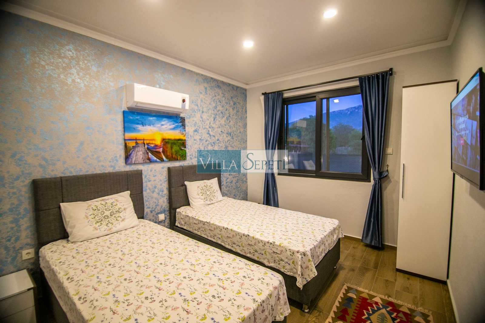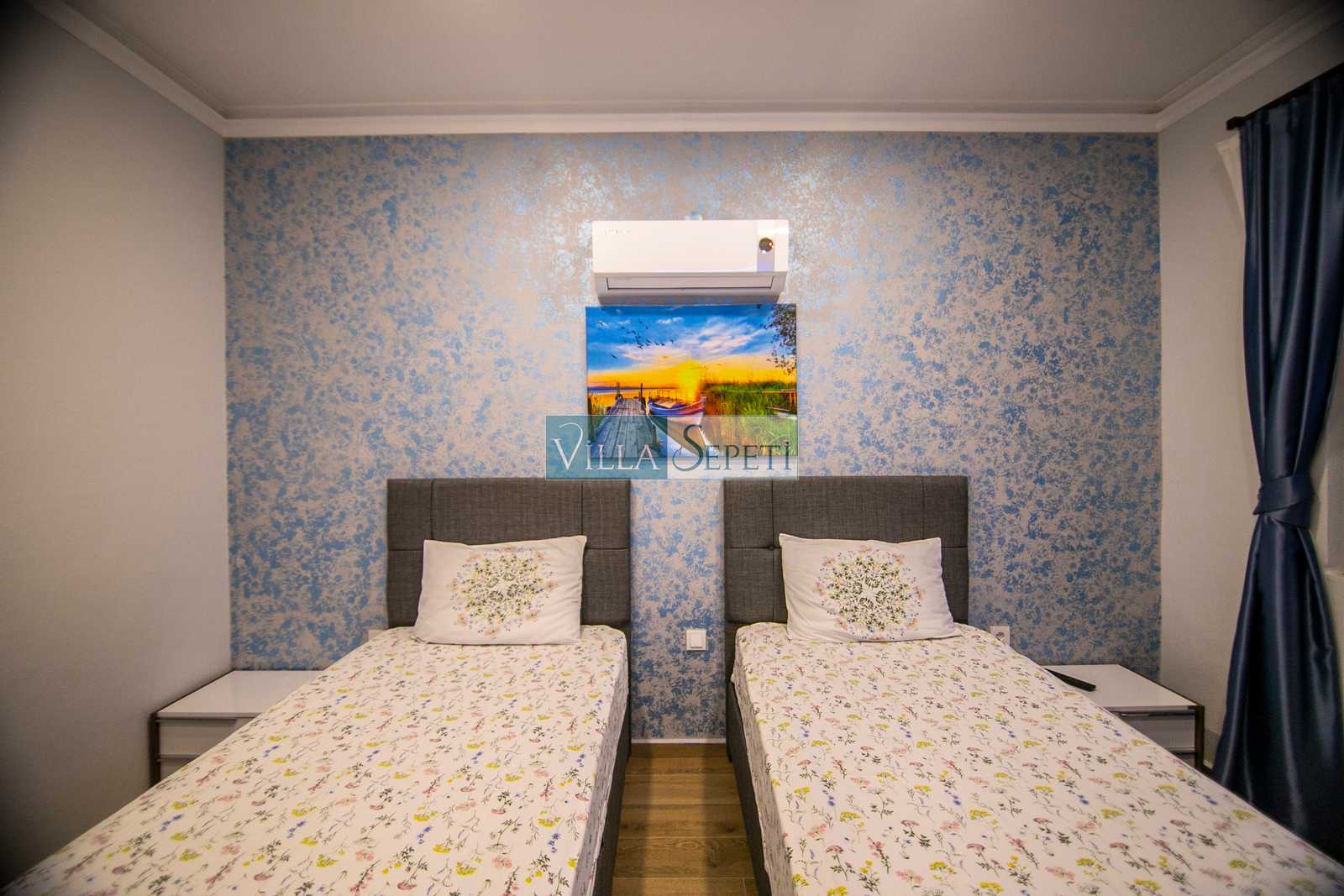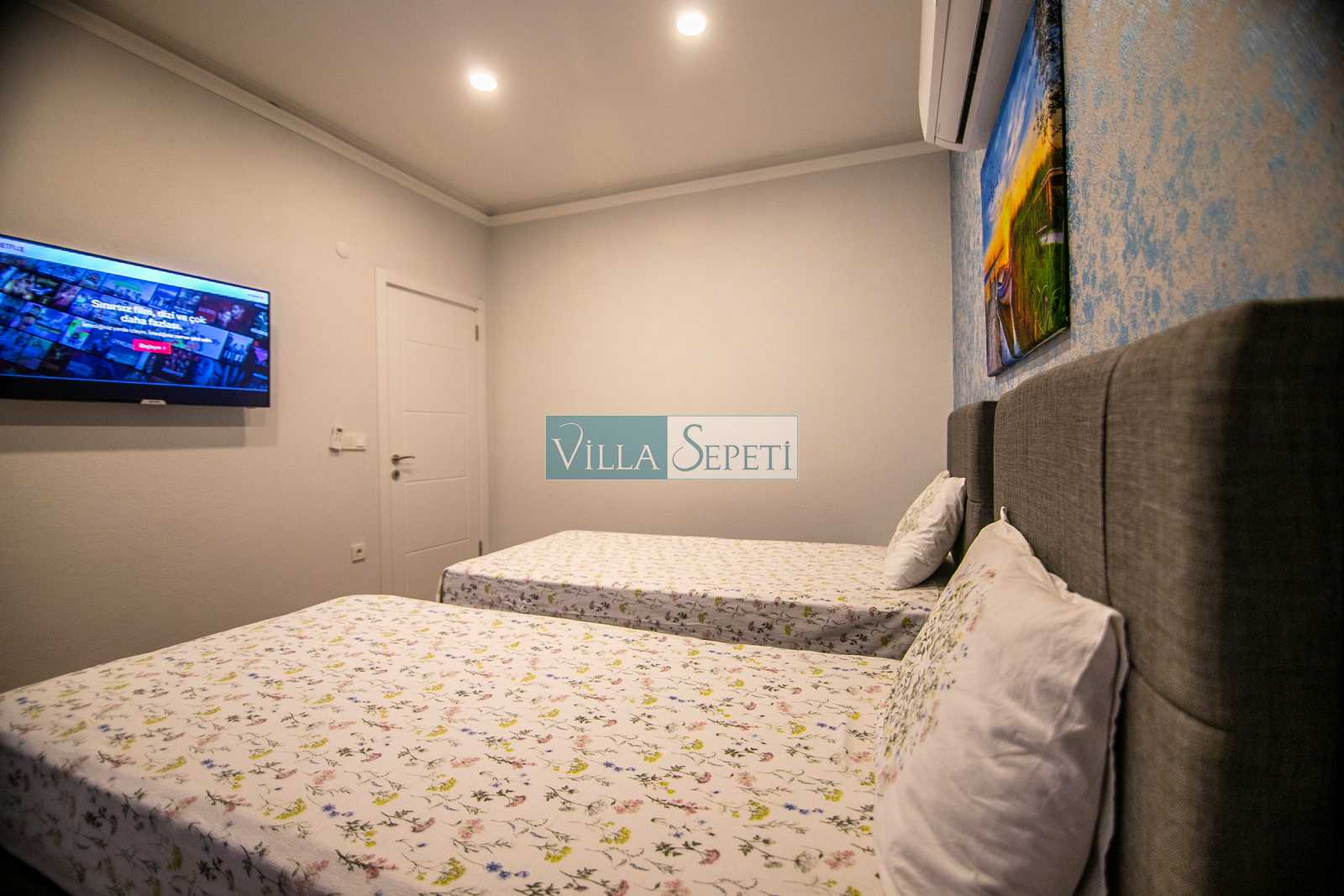 Konforlu ve kaliteli iç tasarıma sahip olan evimiz, 2 yatak odalı ve 4 kişi kapasitesine sahiptir. Birinci yatak odasında çift kişilik yatak, ebeveyn banyosu, jakuzi, TV ve klima yer alırken ikinci yatak odasında iki adet tek kişilik yatak, klima ve TV mevcuttur. Villamızın içerisinde açık mutfak salon, klima, TV ve WC-Duş yer almaktadır.