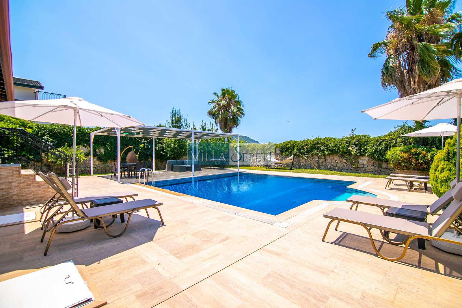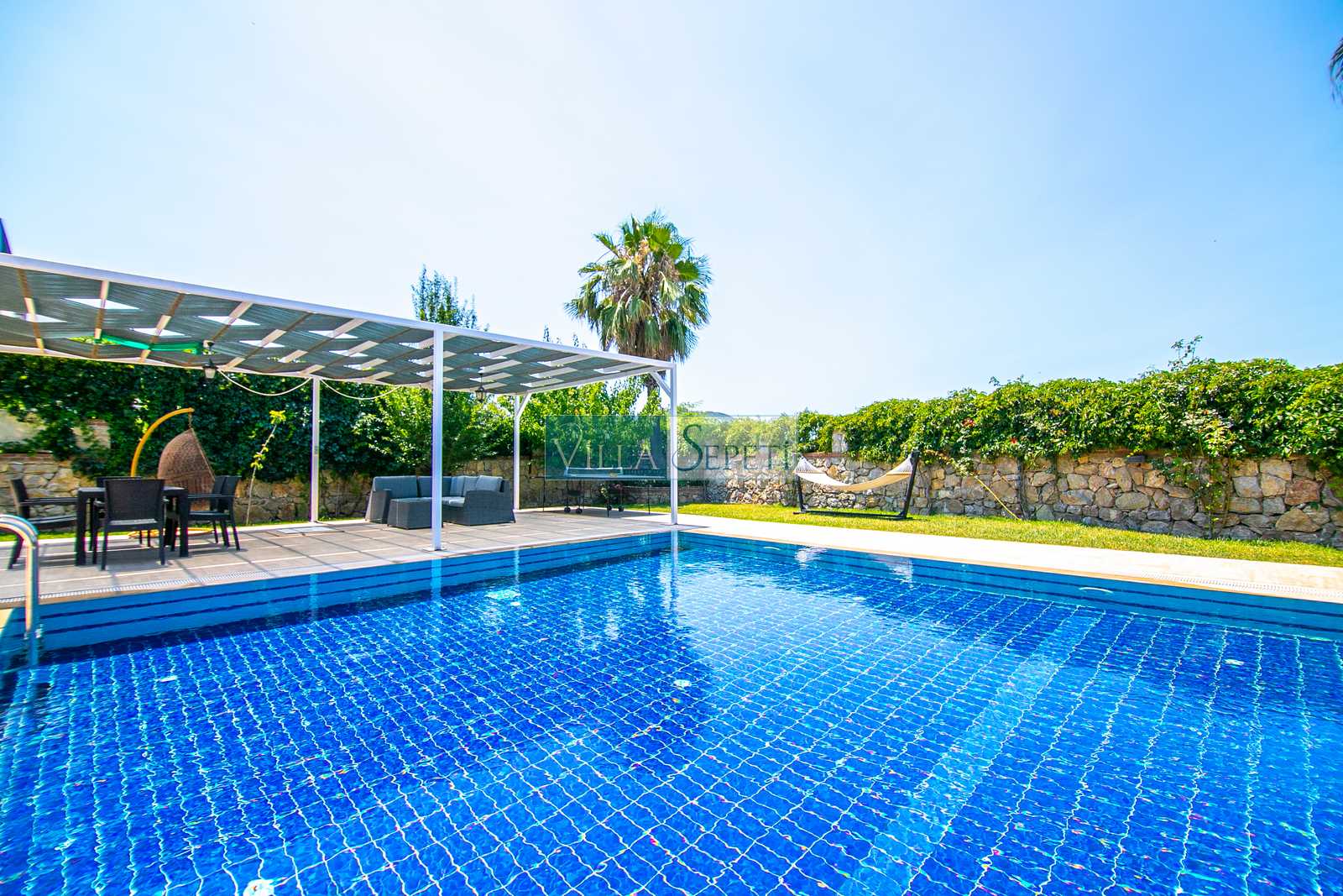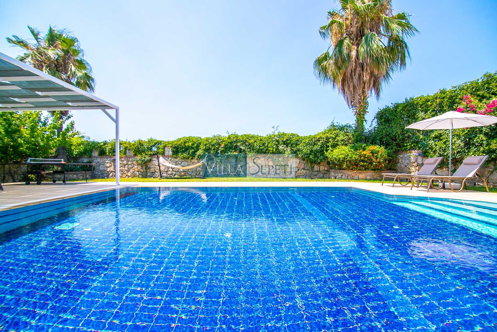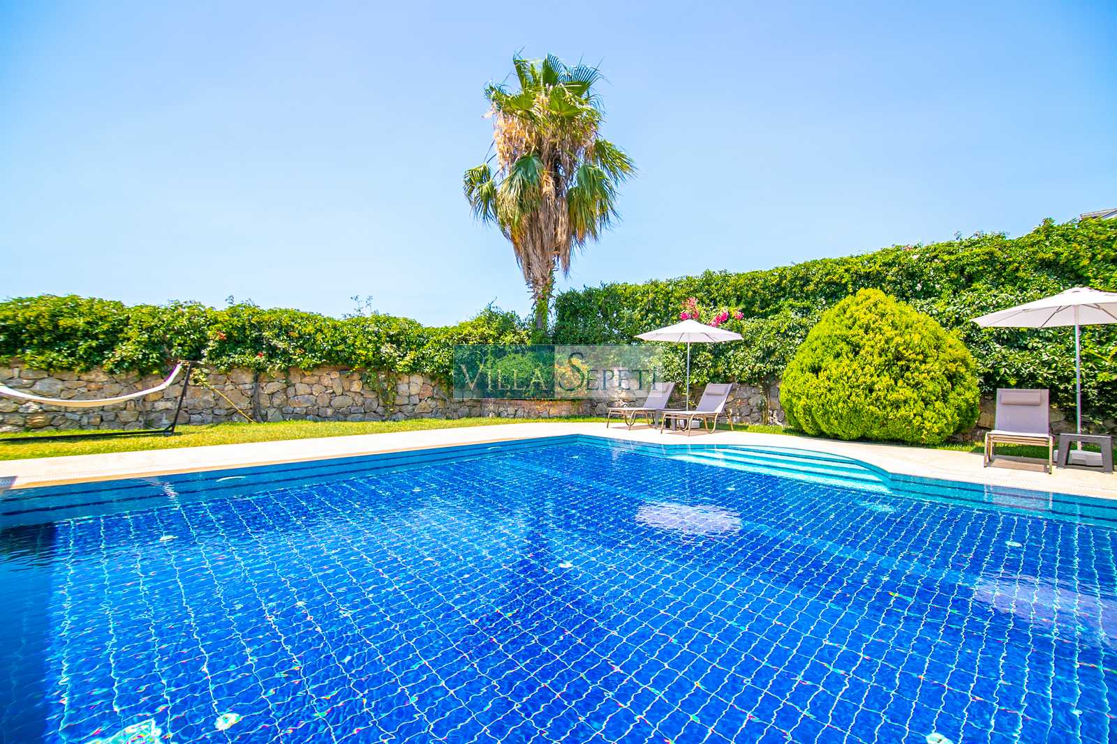 Oldukça korunaklı olan havuzu standart villa havuzlarından daha büyüktür. Havuz korunaklılığı ile ilgili olarak oldukça demememizin sebebi yanındaki villanın çok az kullanılan çatı katındaki küçük pencereden görünme imkanıdır.