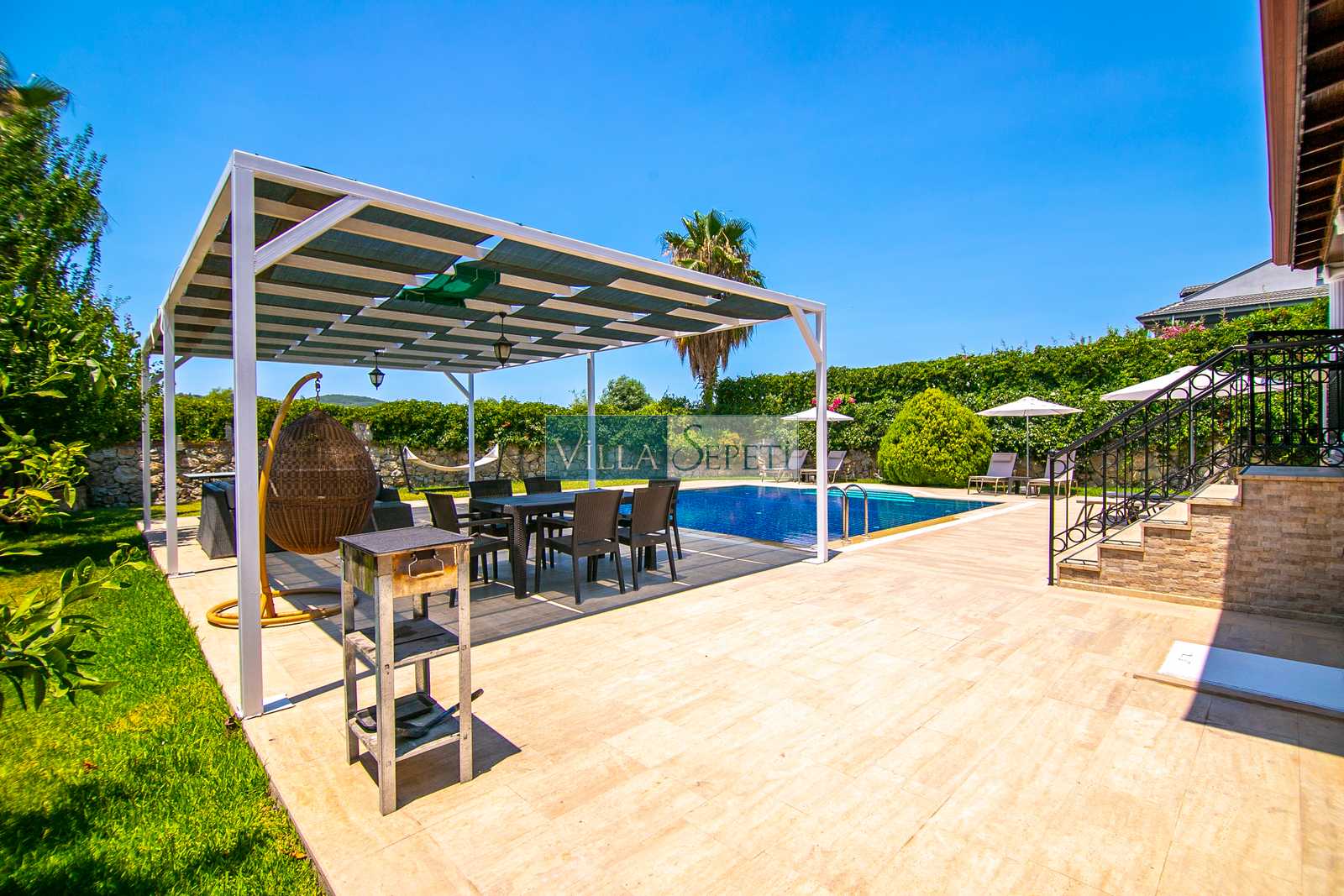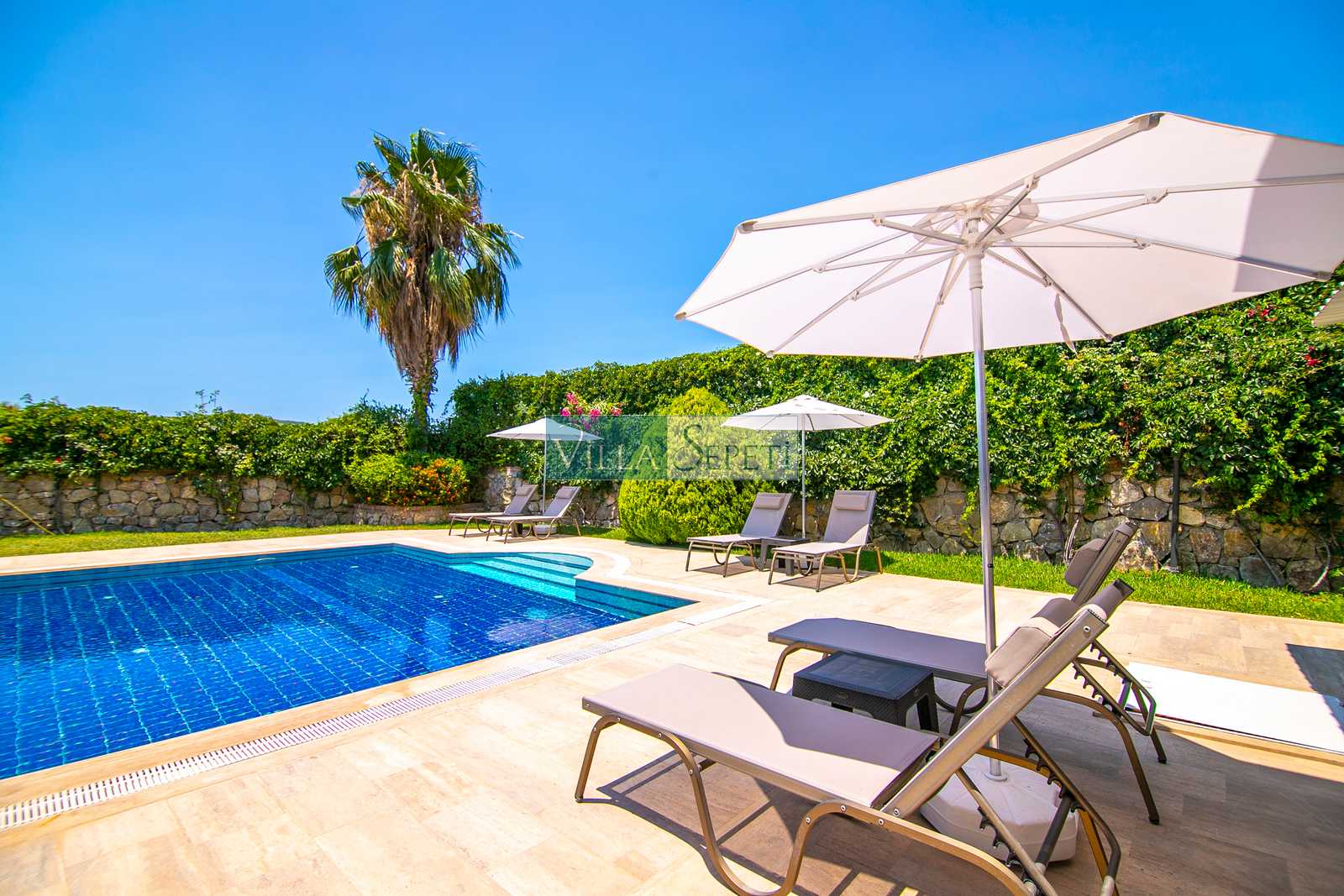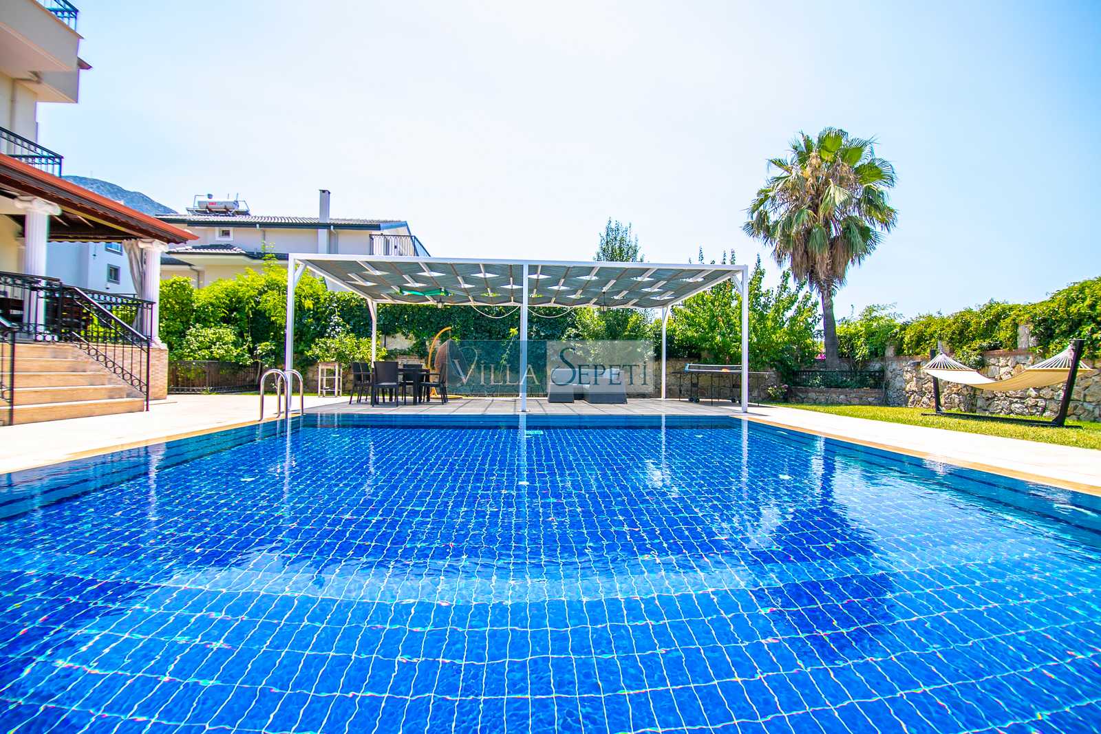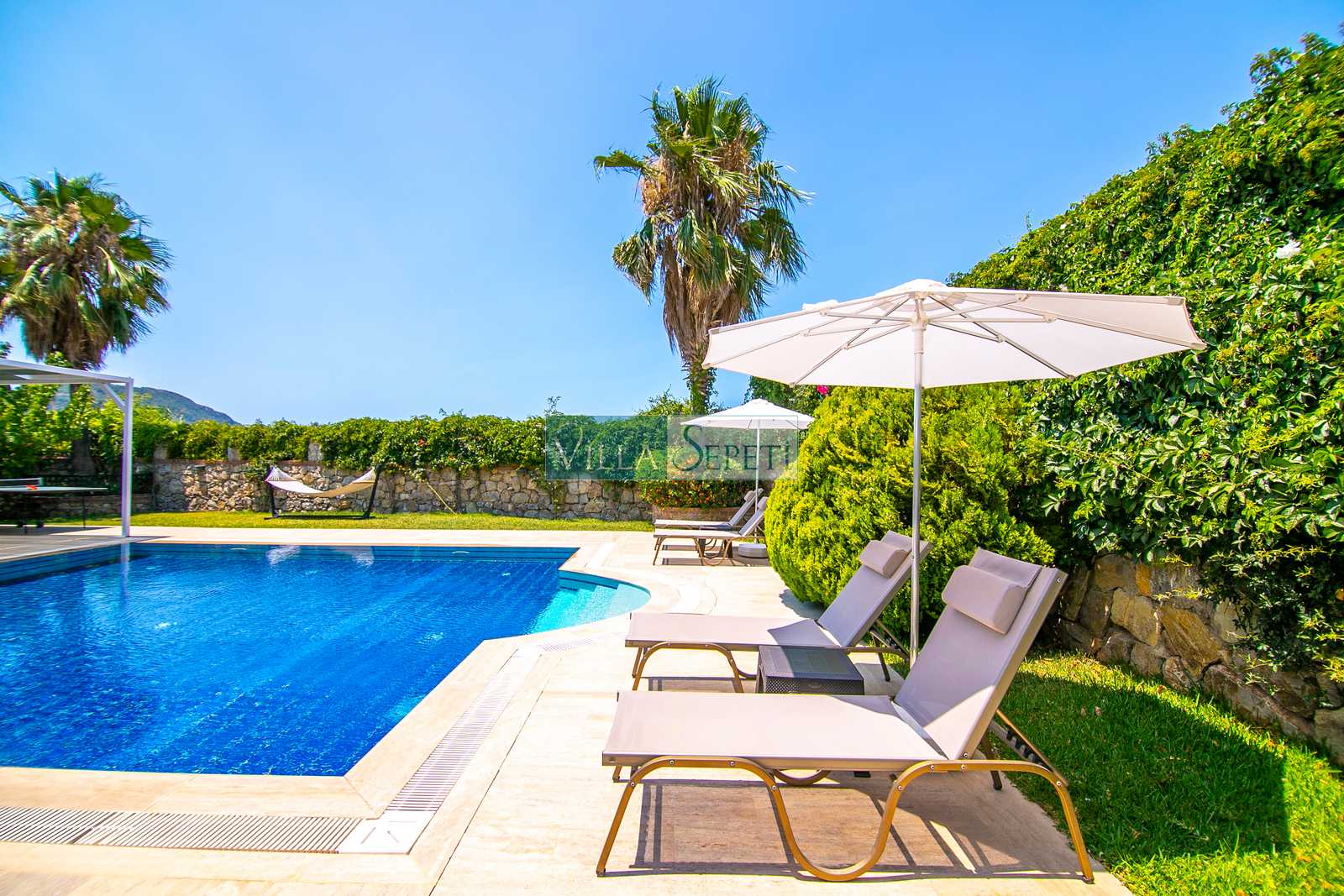 Oldukça korunaklı olan havuzu standart villa havuzlarından daha büyüktür. Havuz korunaklılığı ile ilgili olarak oldukça demememizin sebebi yanındaki villanın çok az kullanılan çatı katındaki küçük pencereden görünme imkanıdır.