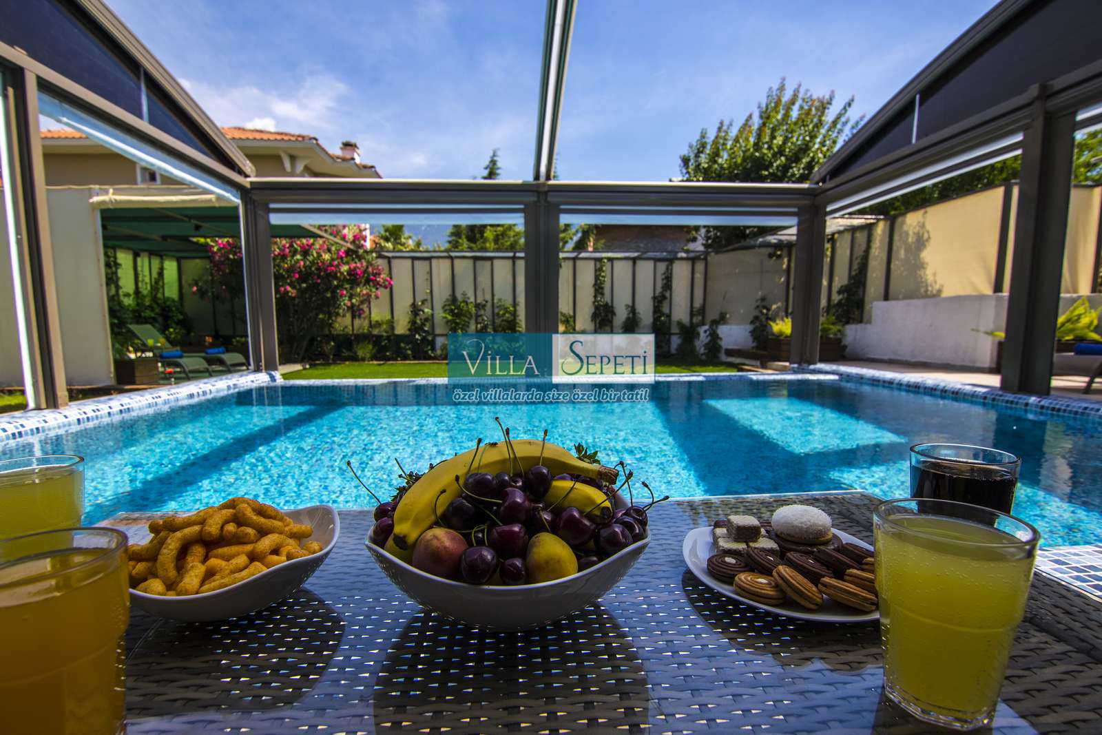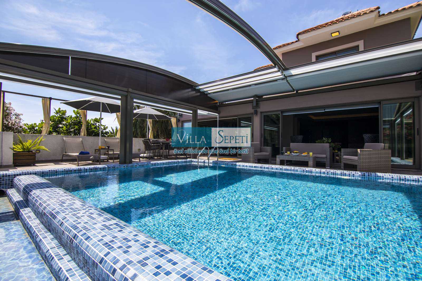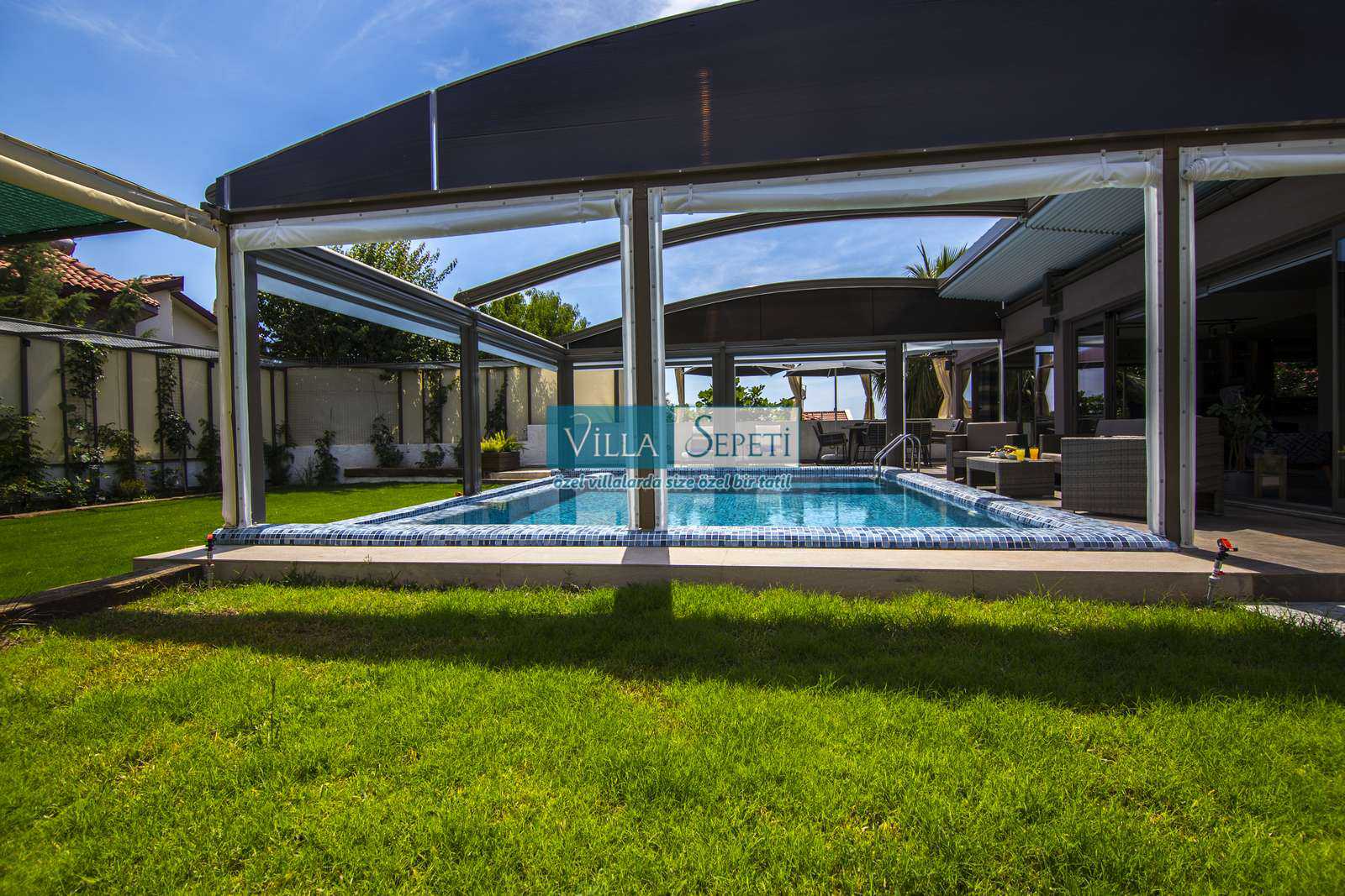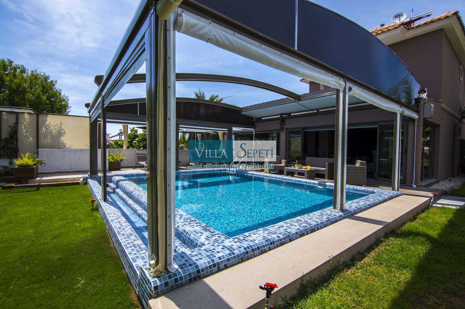 Önemli Not : Villamızın dış havuz kısmında yer alan üstü kapalı tente bölümü kaldırılarak komple açık hale getirilmiştir. Sadece yan kısımları açılır kapanır sisteme sahiptir.