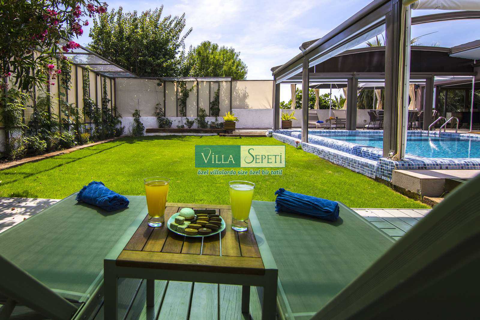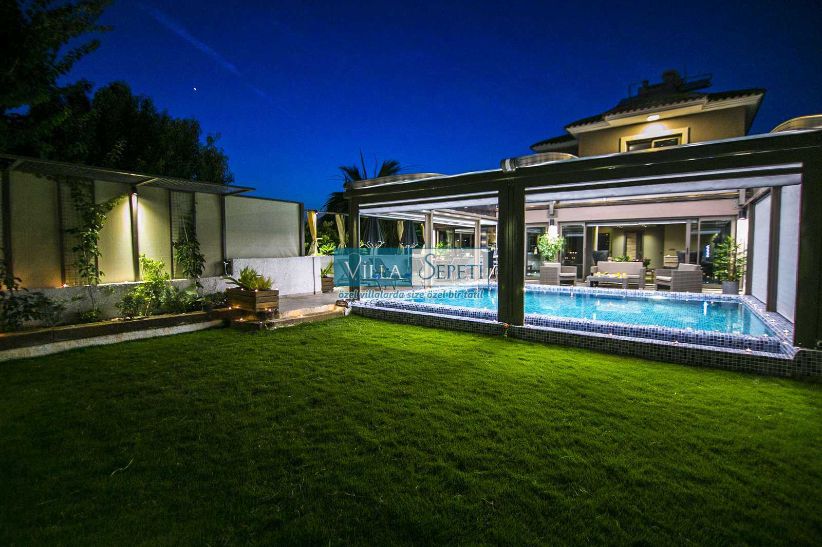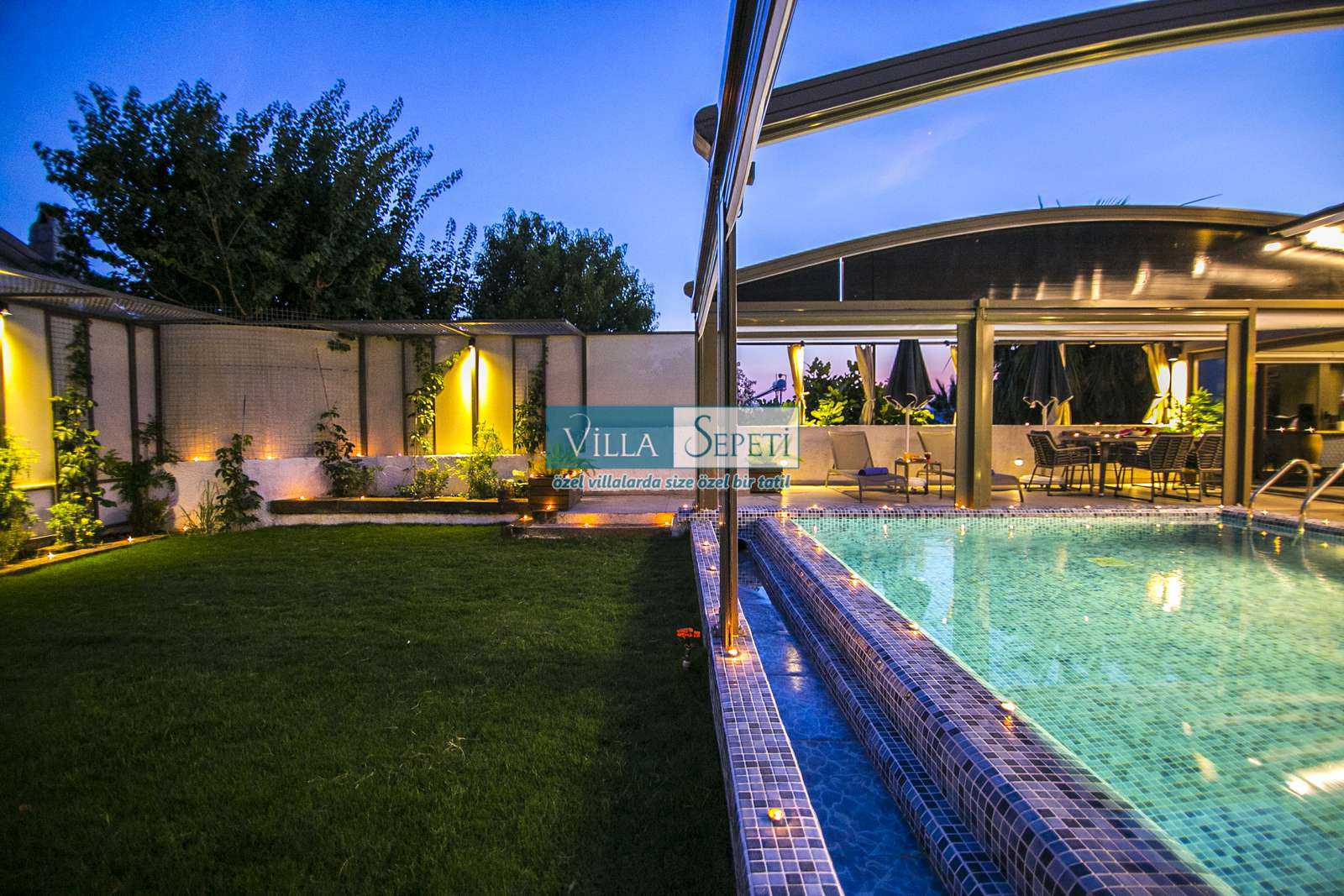 Önemli Not : Villamızın dış havuz kısmında yer alan üstü kapalı tente bölümü kaldırılarak komple açık hale getirilmiştir. Sadece yan kısımları açılır kapanır sisteme sahiptir.