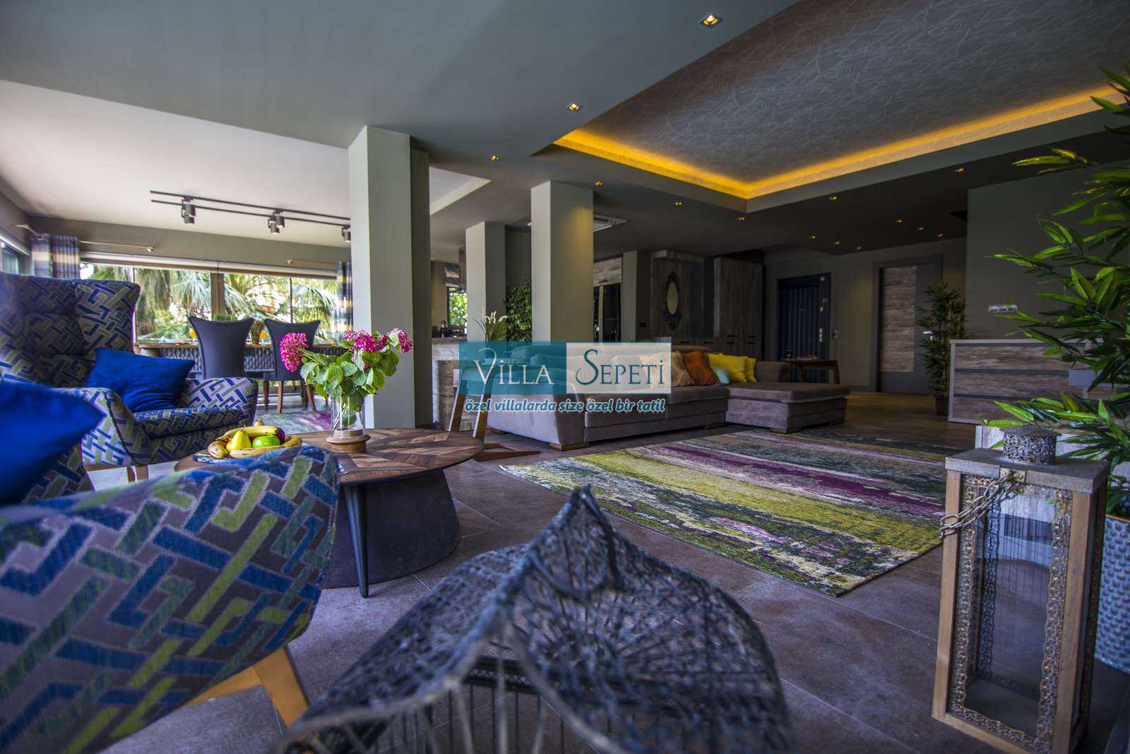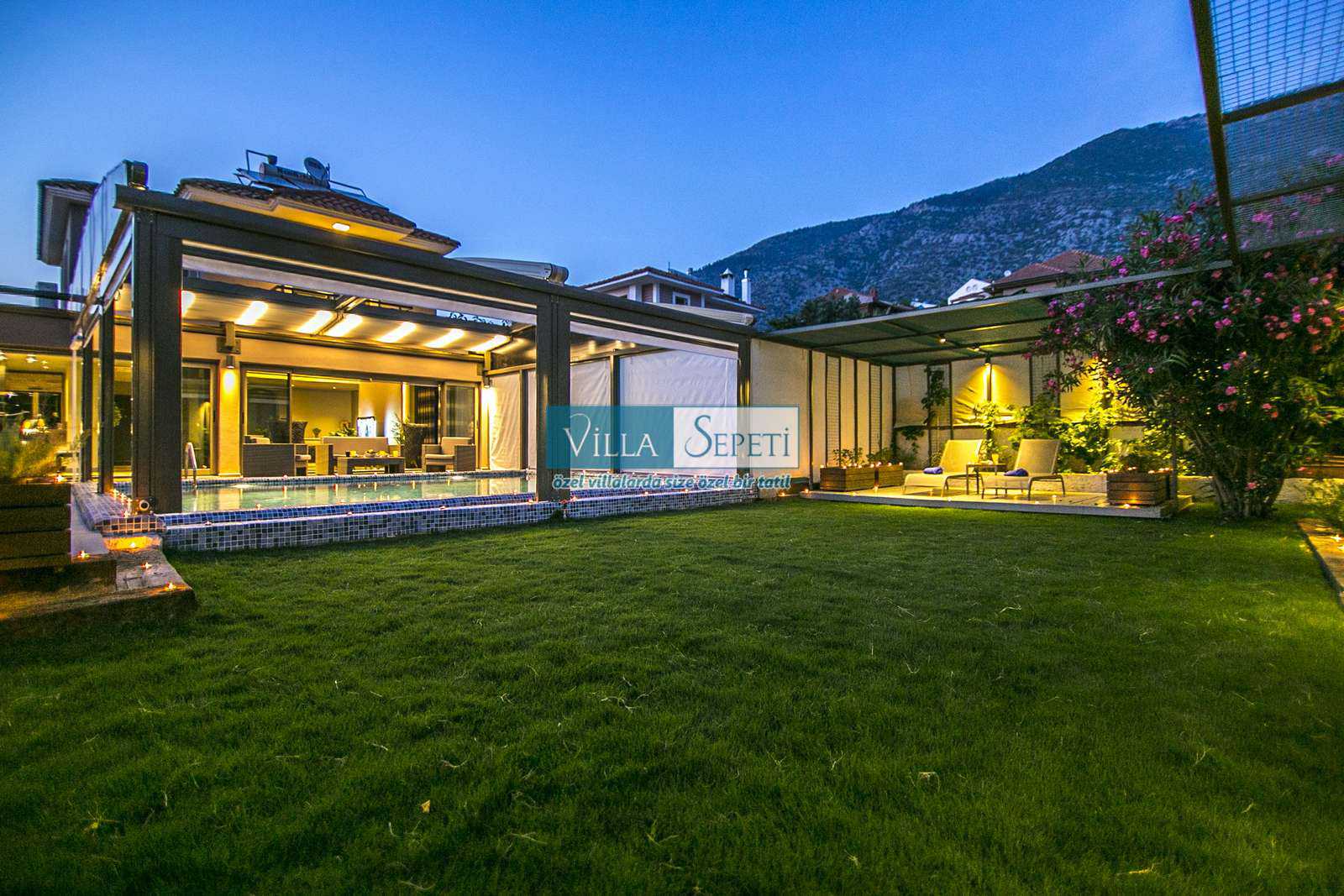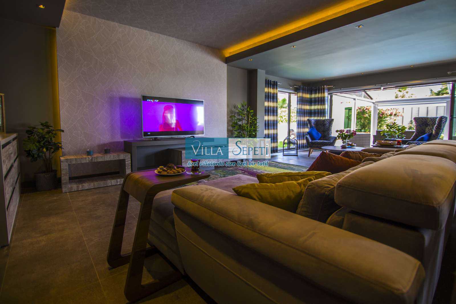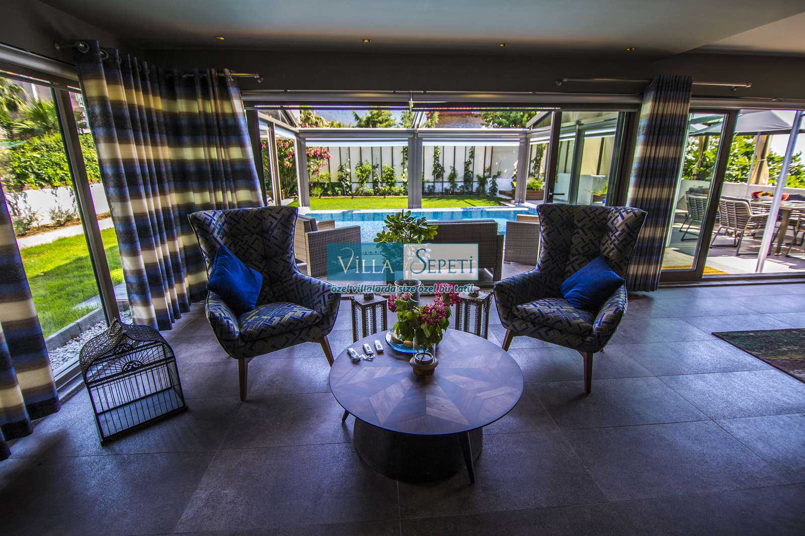 Önemli Not : Villamızın dış havuz kısmında yer alan üstü kapalı tente bölümü kaldırılarak komple açık hale getirilmiştir. Sadece yan kısımları açılır kapanır sisteme sahiptir.