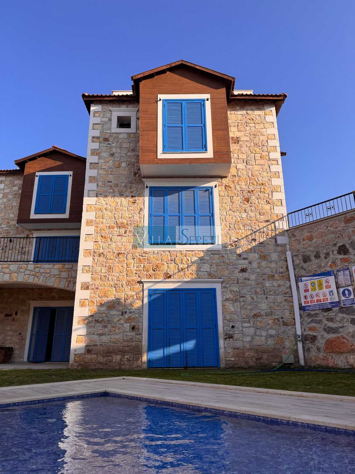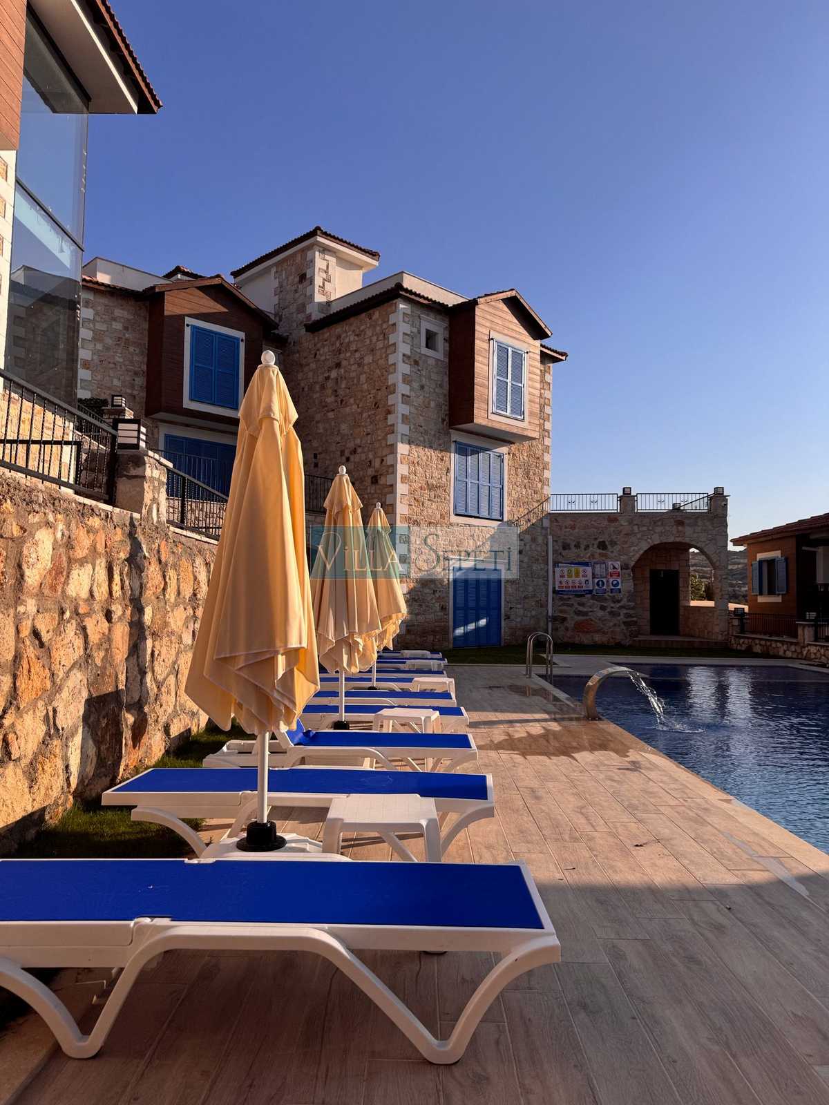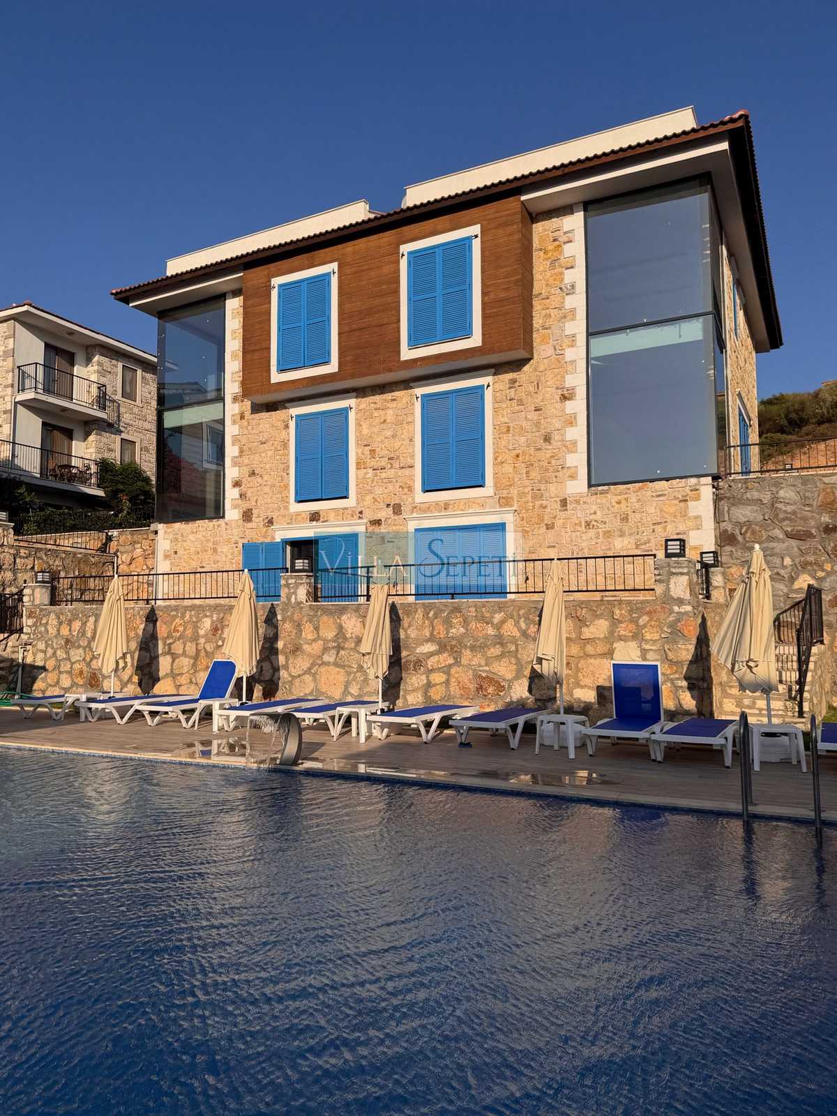 Üç katlı, özel mimari tasarıma sahip Villa Endülüs 1, Yeni Foça mevkiinde konumlanan, kalabalık aileler için ideal, ortak havuzlu bir villa seçeneğidir.