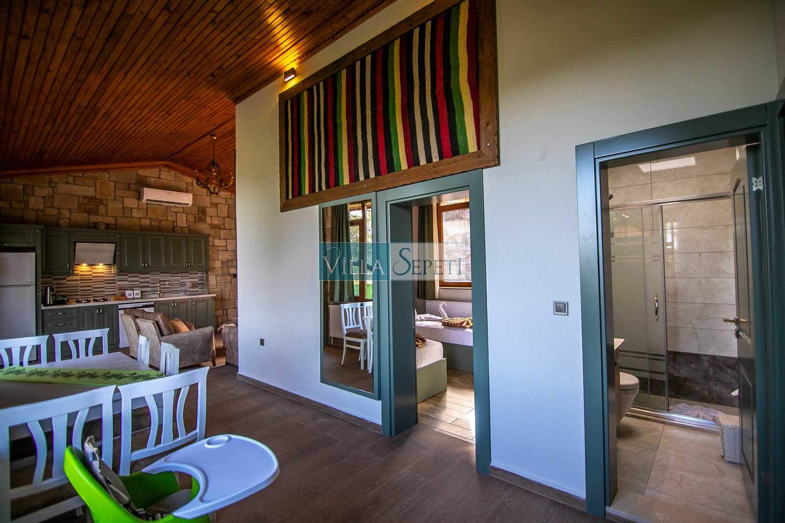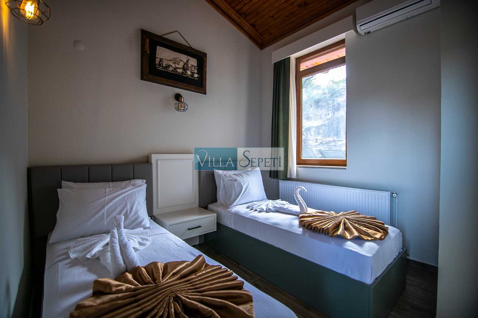 Maksimum 5 kişinin konaklayabileceği villamızın toplam 2 adet yatak odasının birincisinde 1 adet çift kişilik yatak, diğerinde ise 2 adet tek kişilik yatak bulunmaktadır. Ayrıca salonda 1 kişilik yatma imkanı vardır. Farklı bir mimari ve iç tasarım ürünü olan villamızın tüm alanlarından doğa manzarası izlenebilmektedir.