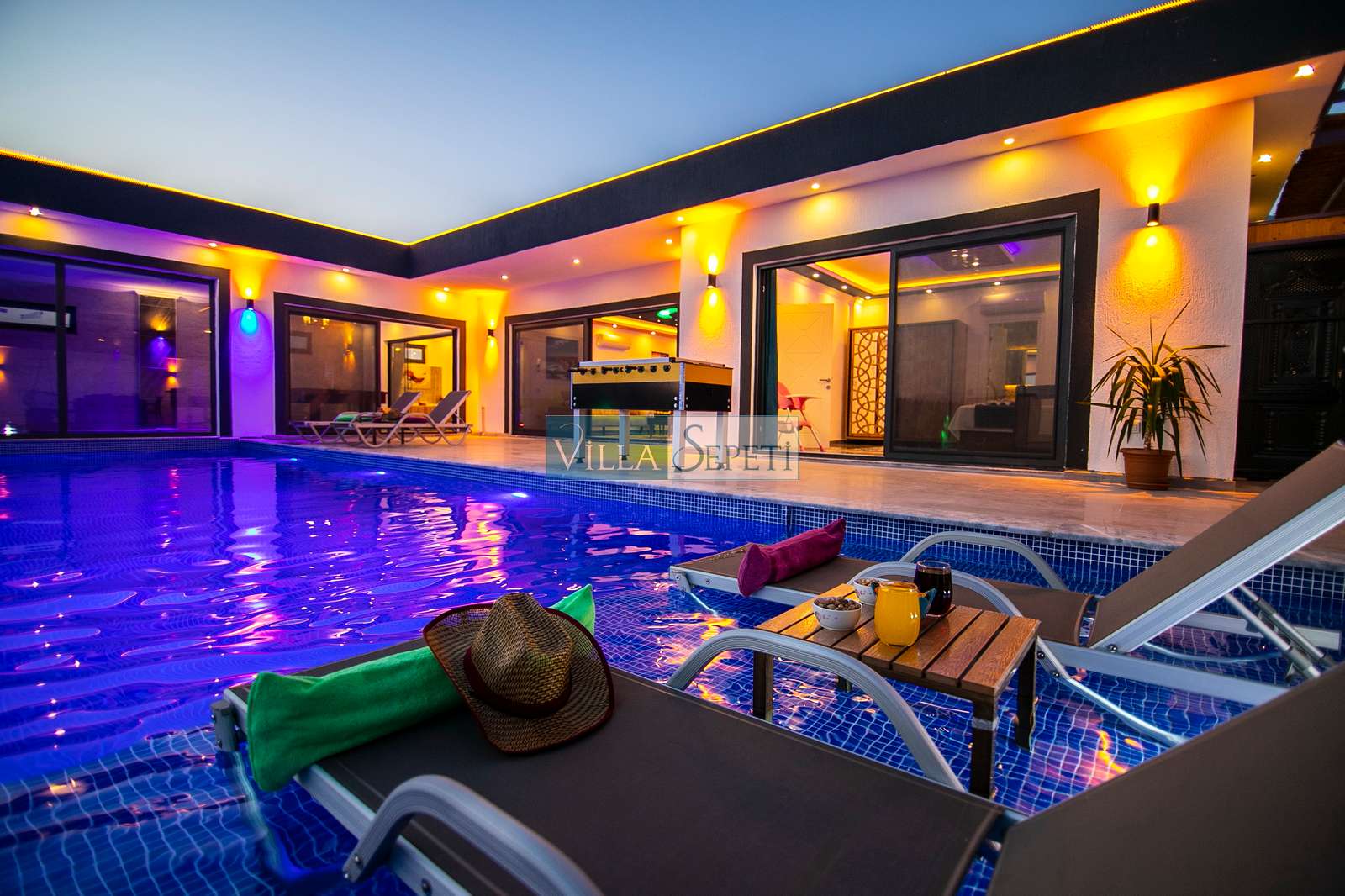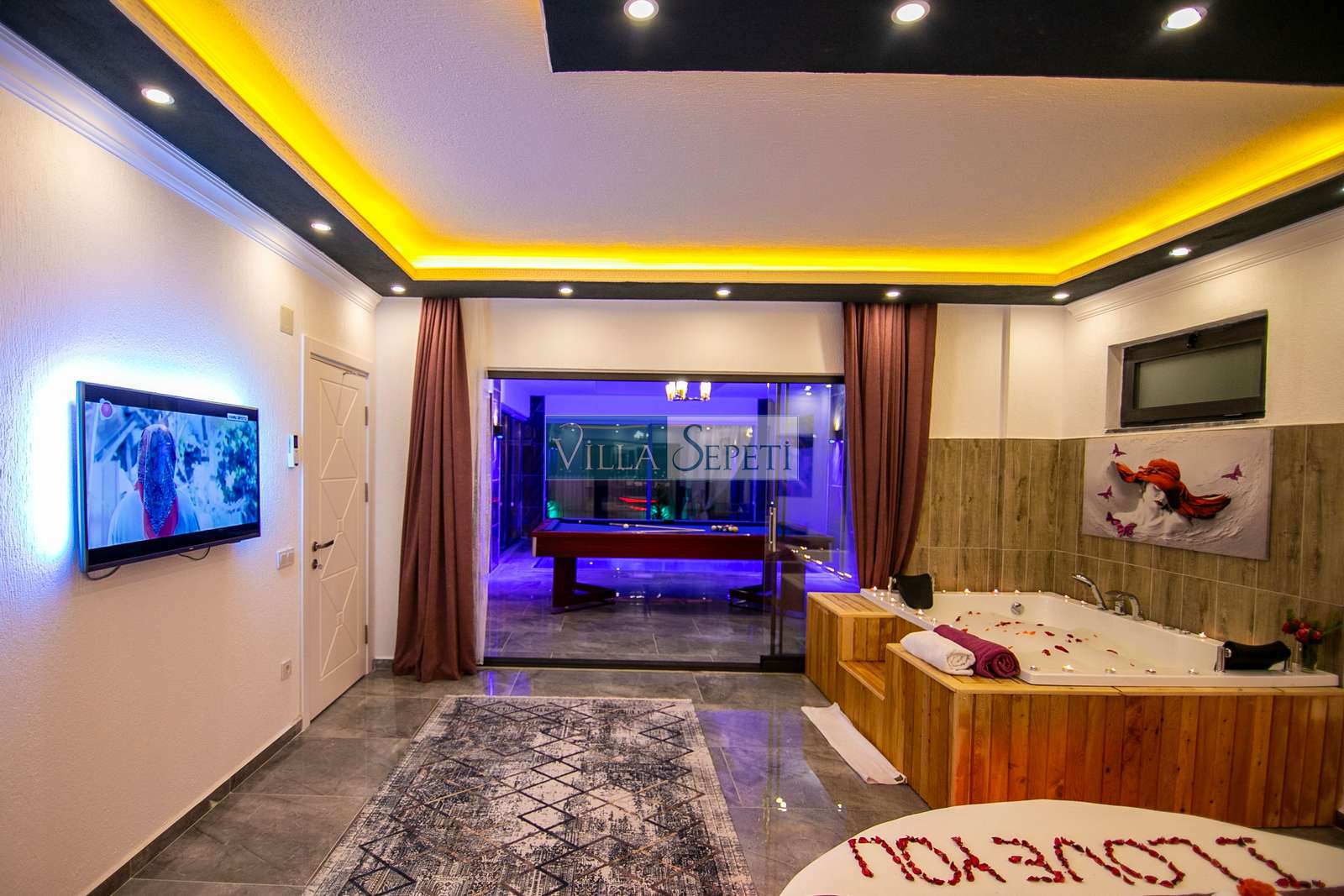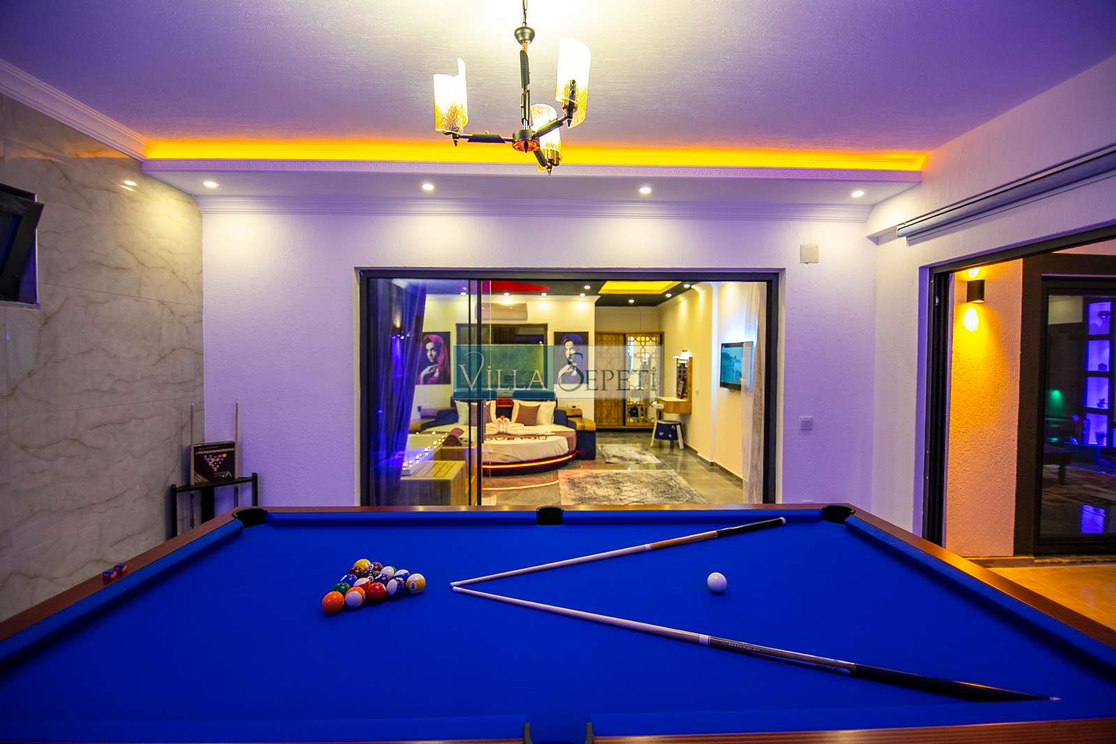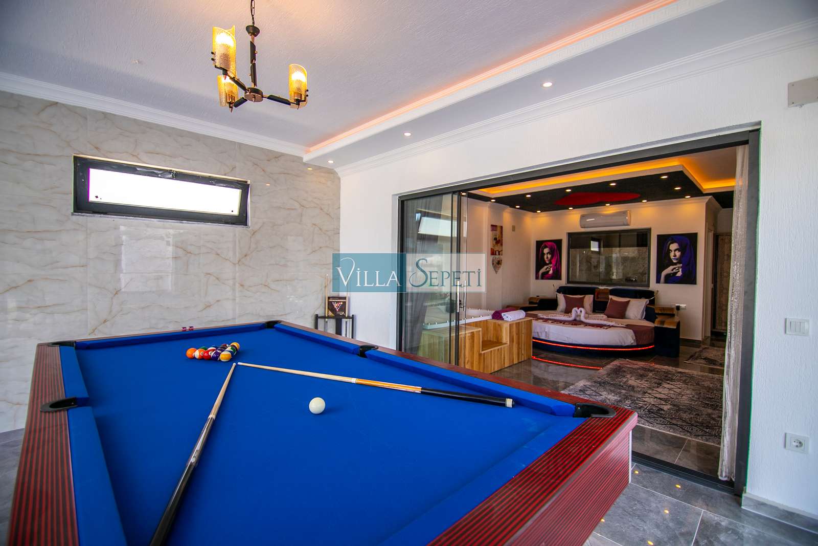 Villamızda iki yatak odası ve iki banyo bulunmaktadır. Birinci yatak odasında çift kişilik yatak, klima, jakuzi, televizyon, ısıtmalı iç havuz ve banyo bulunmaktadır. İkinci yatak odasında ise iki tek kişilik yatak, klima ve banyo yer almaktadır. Salon içerisinde mutfak, oturma grubu, televizyon ve klima mevcuttur.