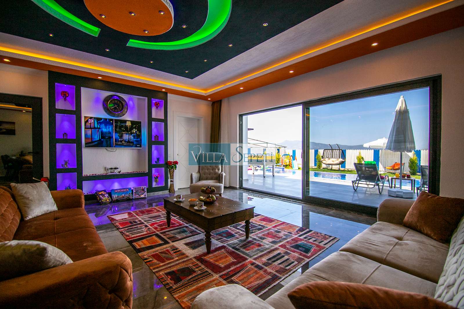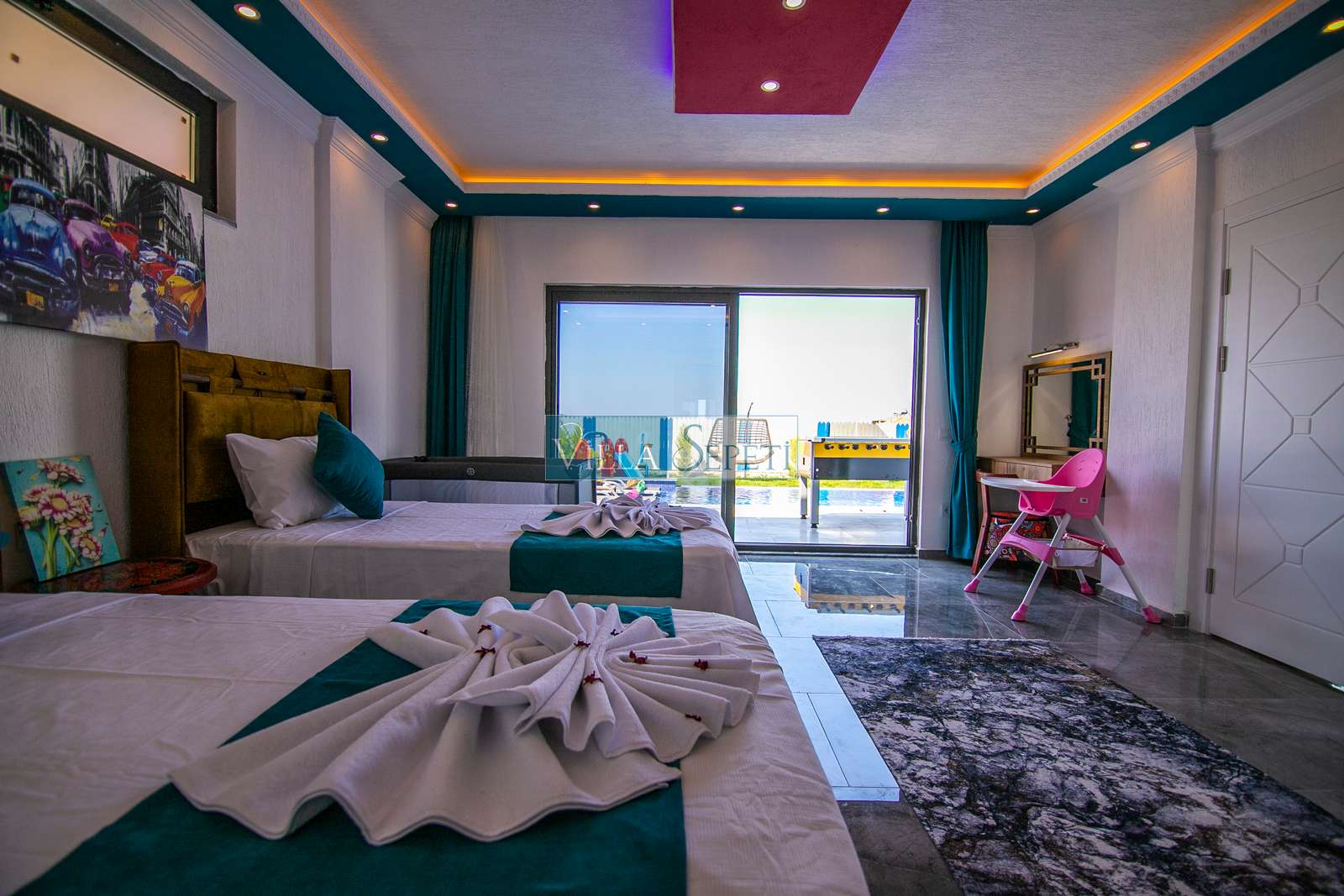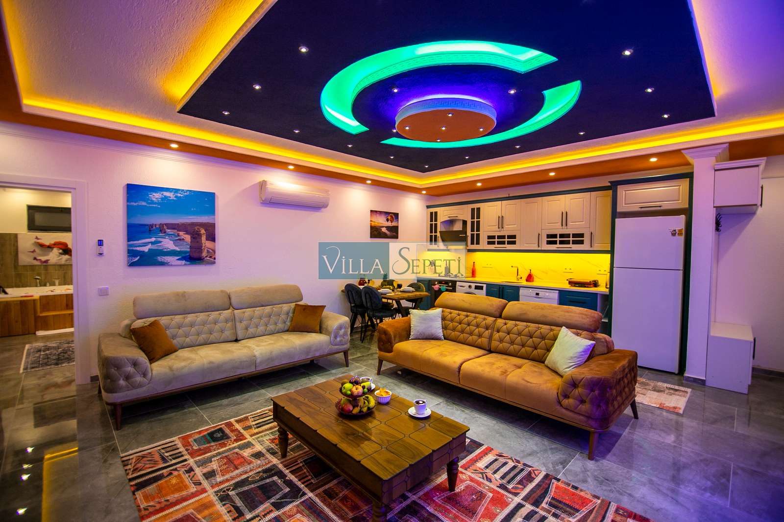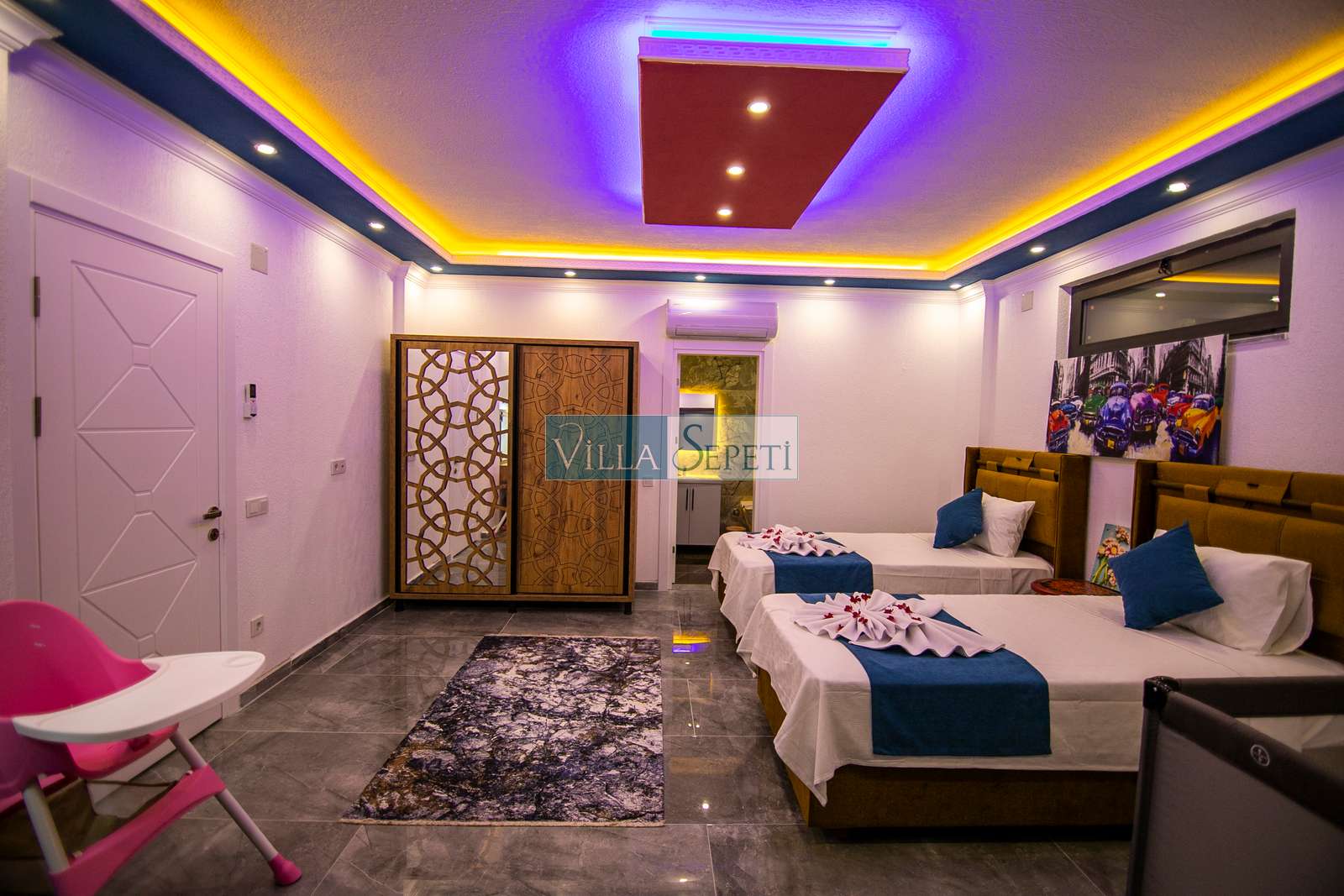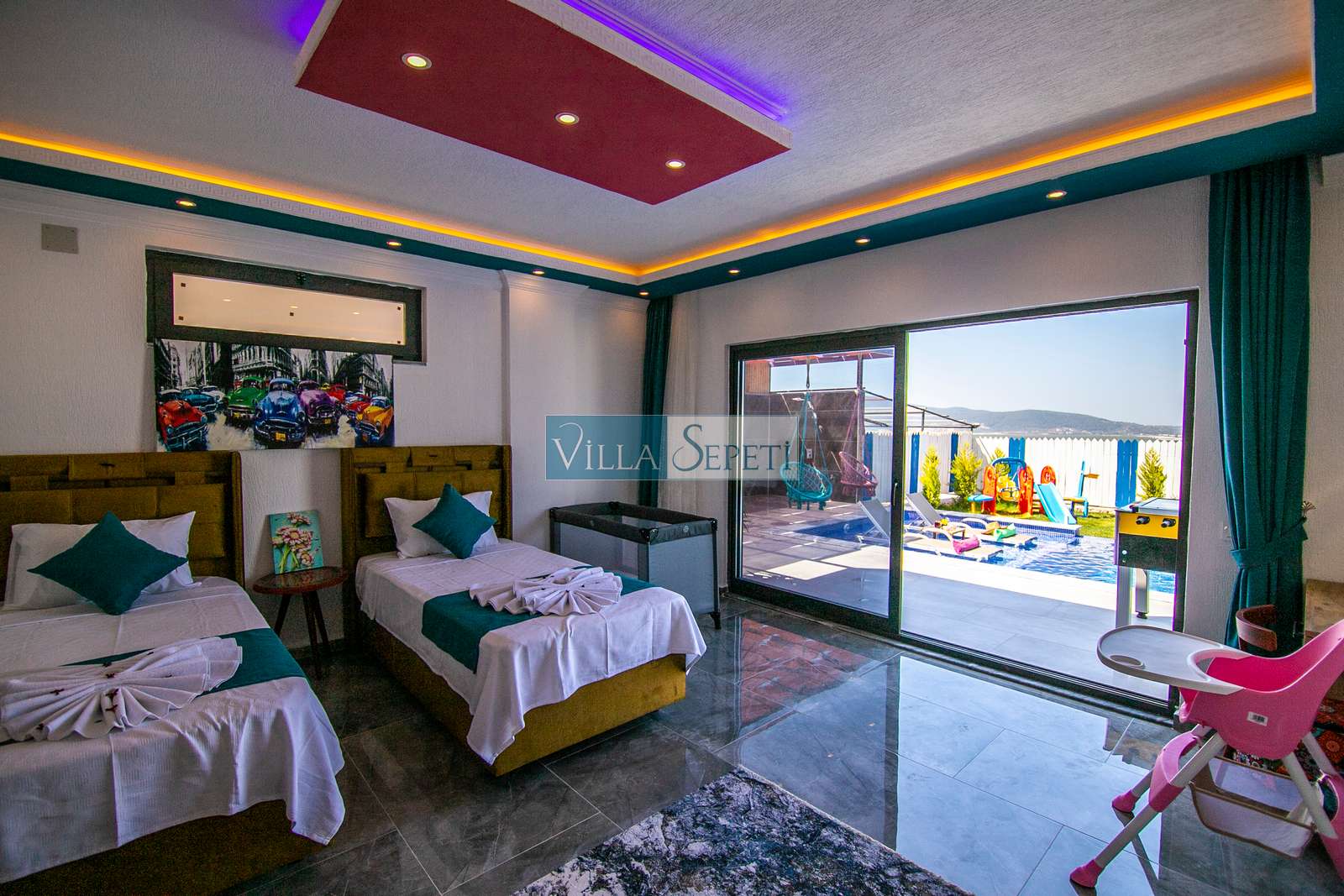 Villamızda iki yatak odası ve iki banyo bulunmaktadır. Birinci yatak odasında çift kişilik yatak, klima, jakuzi, televizyon, ısıtmalı iç havuz ve banyo bulunmaktadır. İkinci yatak odasında ise iki tek kişilik yatak, klima ve banyo yer almaktadır. Salon içerisinde mutfak, oturma grubu, televizyon ve klima mevcuttur.