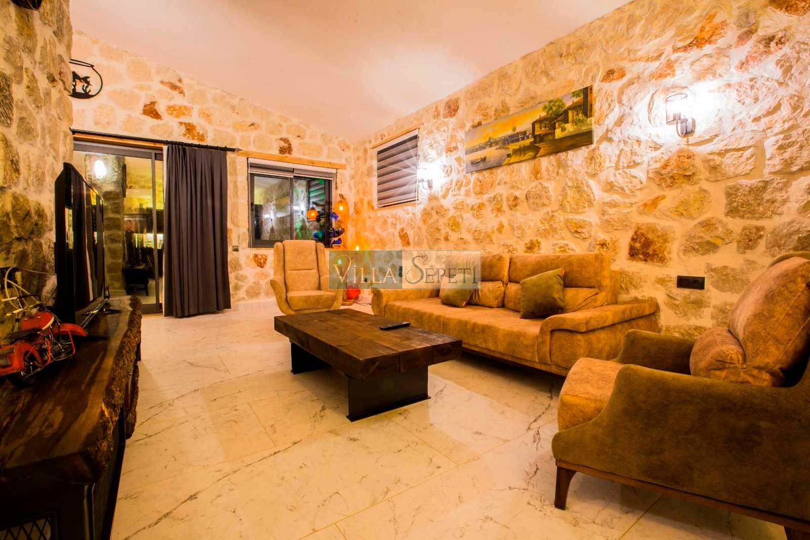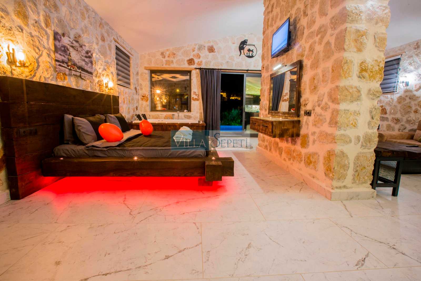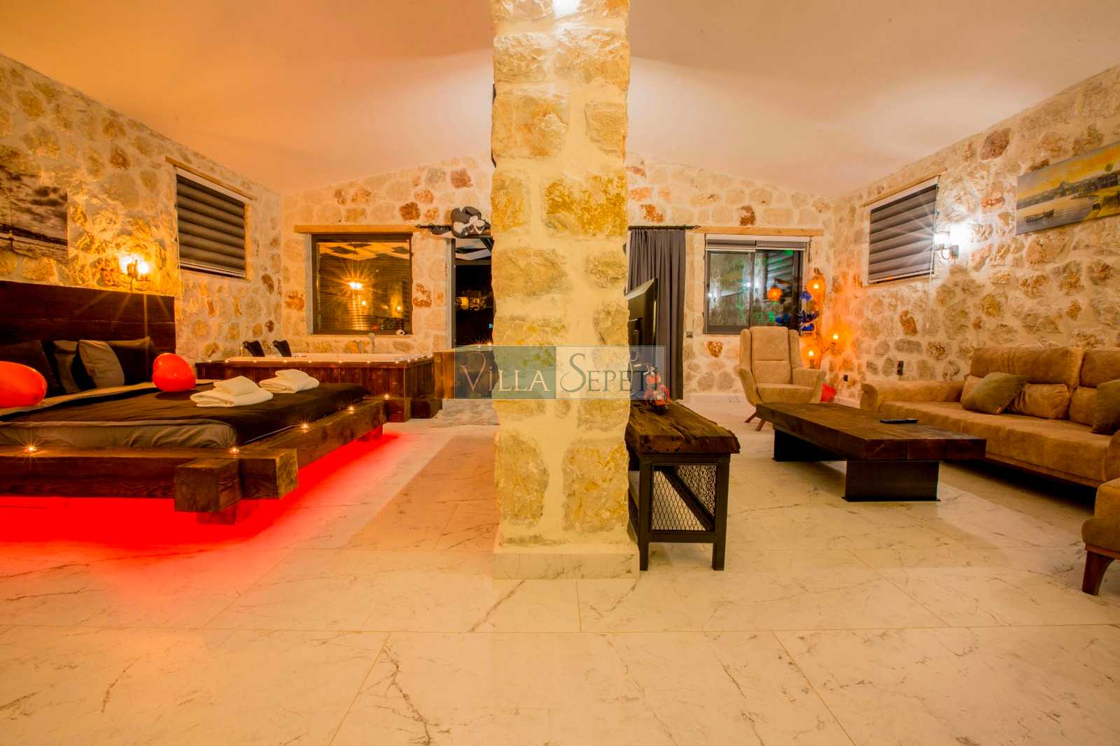 Villamız stüdyo tarzında döşenmiştir. İçerisinde bir adet yatak odası, bir adet banyo, salon ve mutfak bulunmaktadır. Yatak odası bölümünde çift kişilik yatak, klima, banyo ve jakuzi bulunmaktadır. Doğal bir iç dizayna sahip villamızın mutfak detayları da zevkli bir şekilde hazırlanmıştır.