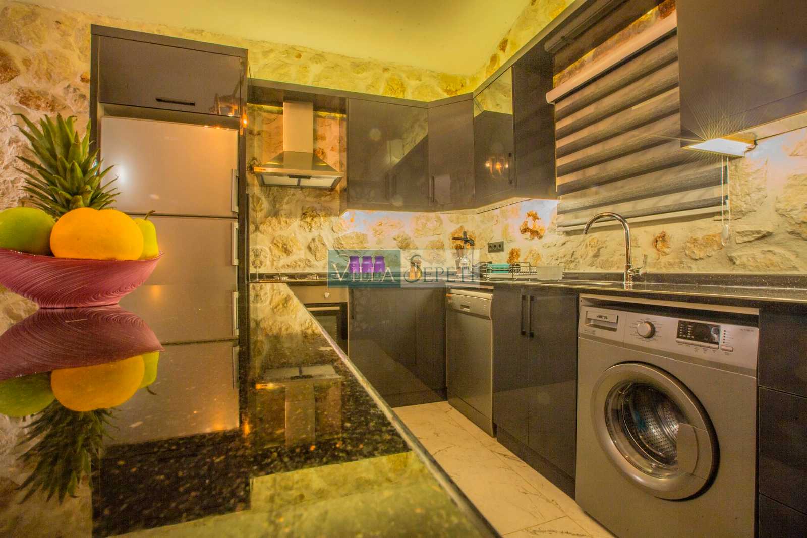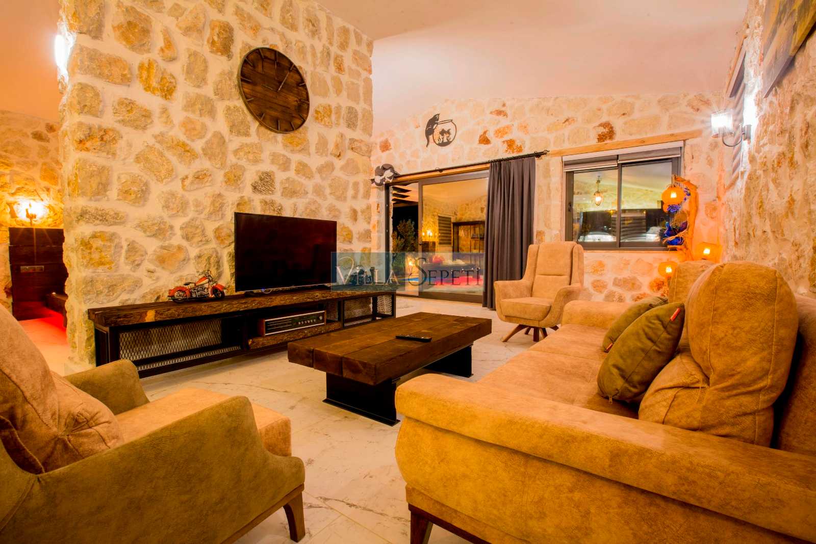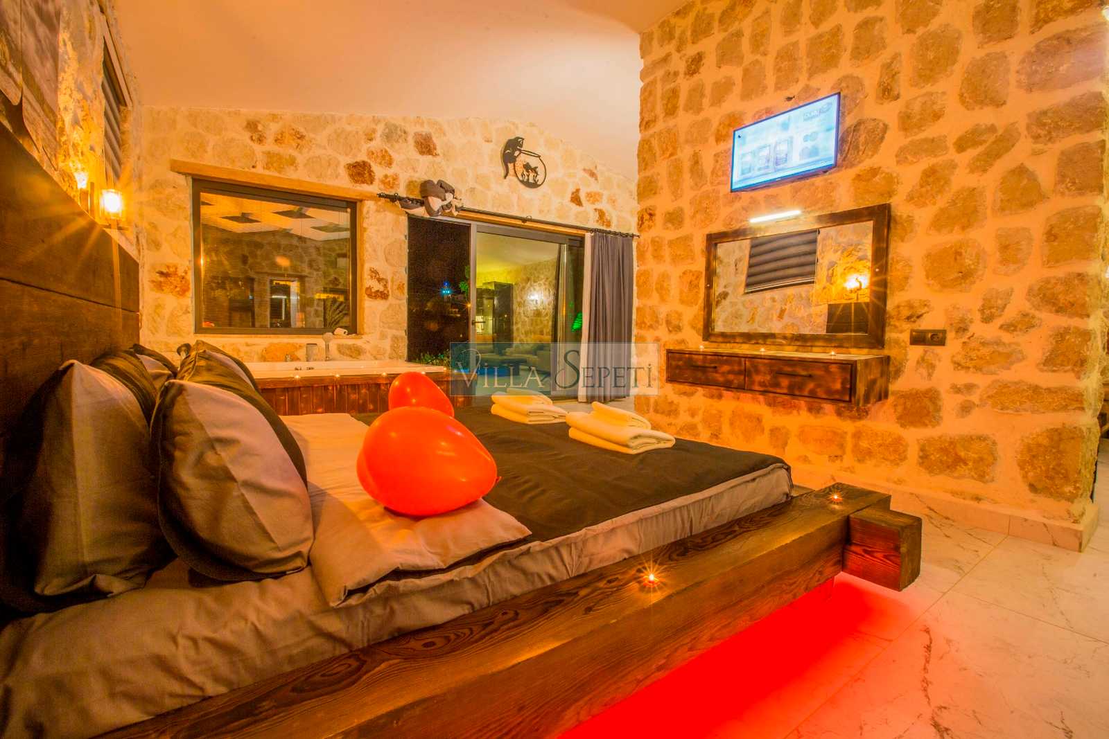 Villamız stüdyo tarzında döşenmiştir. İçerisinde bir adet yatak odası, bir adet banyo, salon ve mutfak bulunmaktadır. Yatak odası bölümünde çift kişilik yatak, klima, banyo ve jakuzi bulunmaktadır. Doğal bir iç dizayna sahip villamızın mutfak detayları da zevkli bir şekilde hazırlanmıştır.