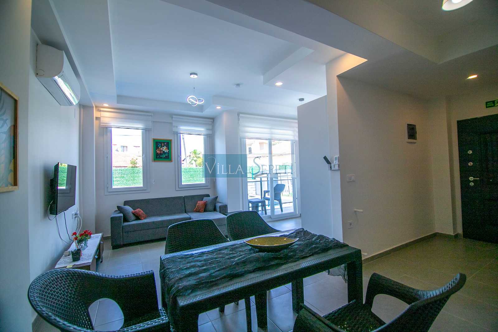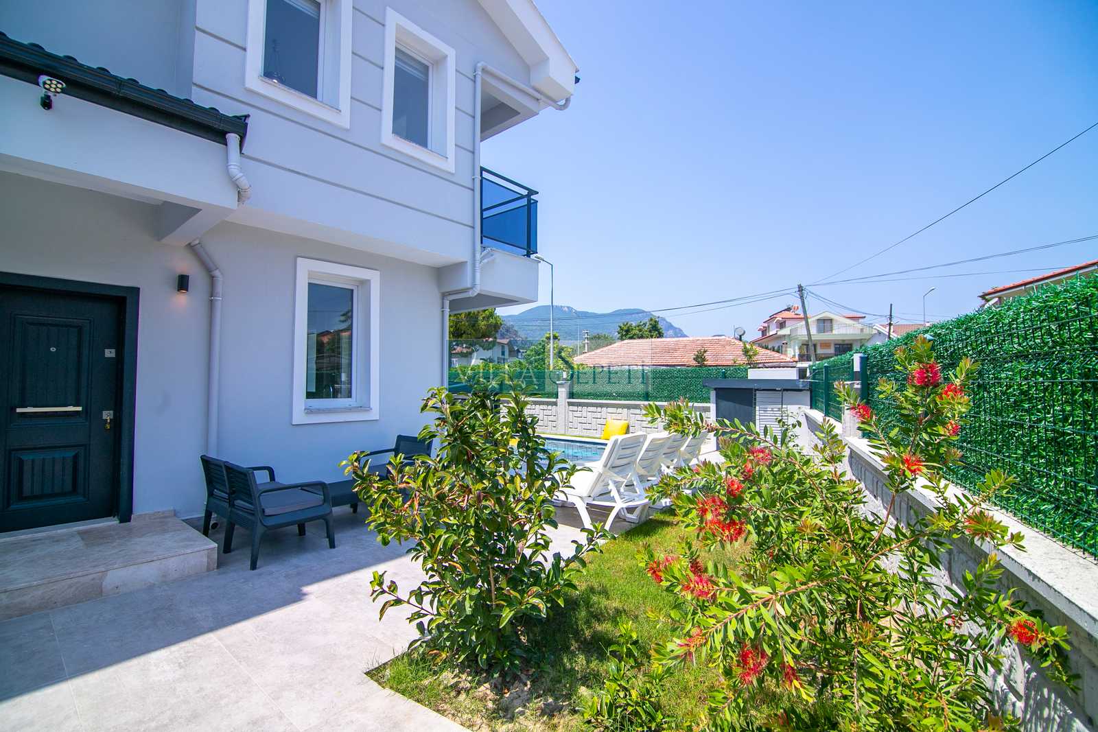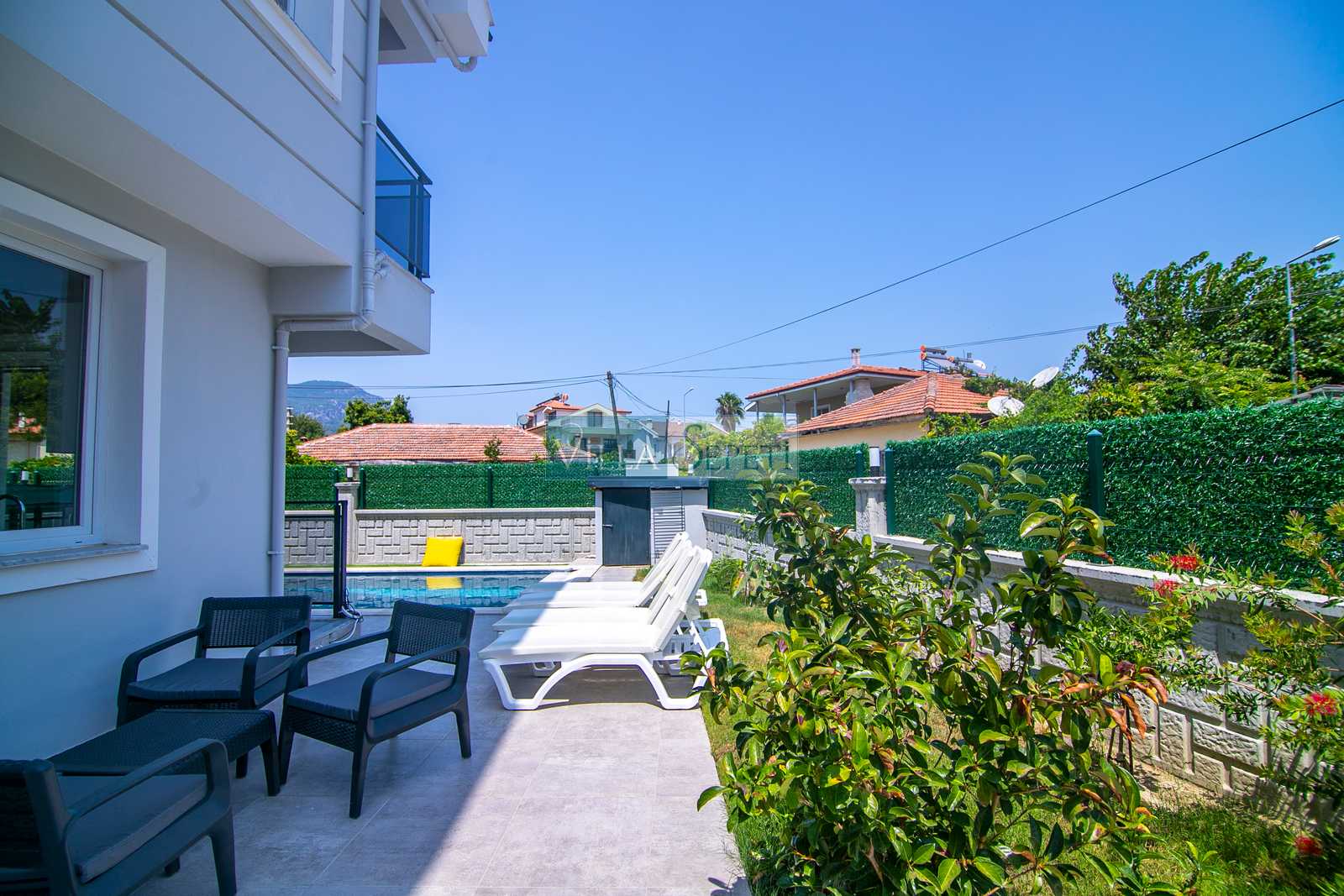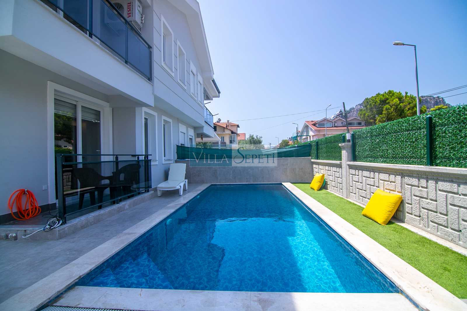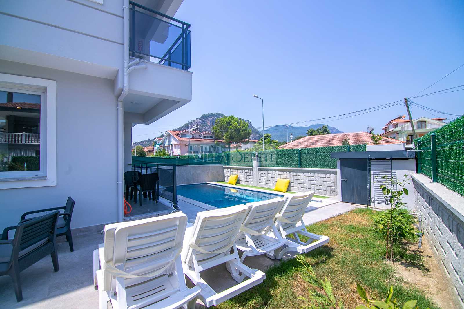 Villanın dış alanında küçük ama keyifli bir yeşil bahçe alanı bulunur. Bahçede oturma grubu sayesinde günün her saati açık havada dinlenme, kitap okuma veya kahvenizi yudumlayarak huzurlu vakit geçirme imkânı sunar. Özel yüzme havuzu, yaz sıcağında serinleyebileceğiniz özel bir alan oluşturur. Villamız, Dalyan merkeze yürüme mesafesinde olması sayesinde restoranlara, marketlere ve nehir kenarındaki keyifli yürüyüş alanlarına kolay erişim imkânı sunar.