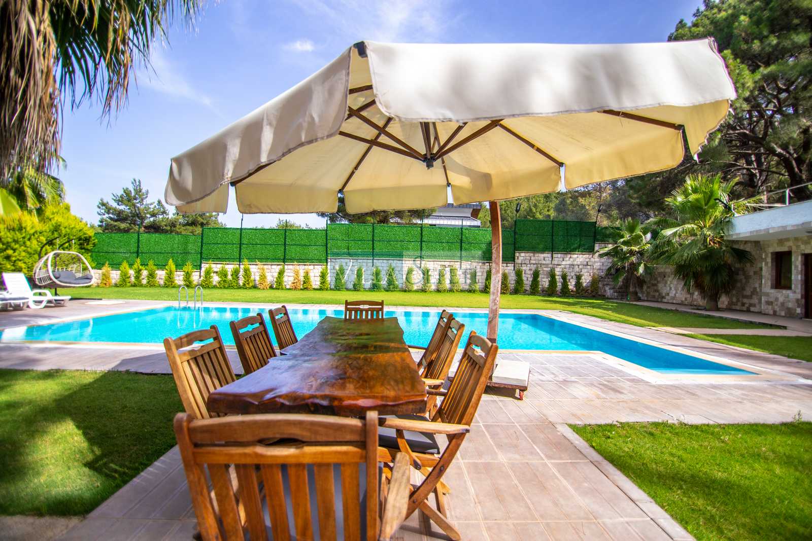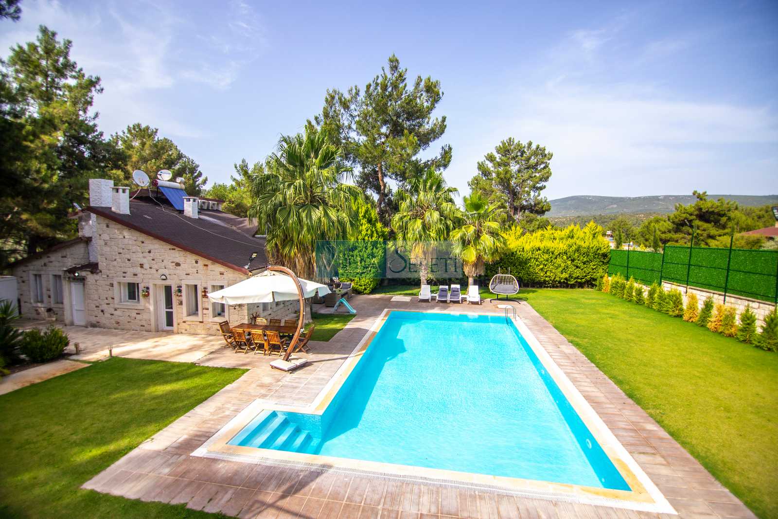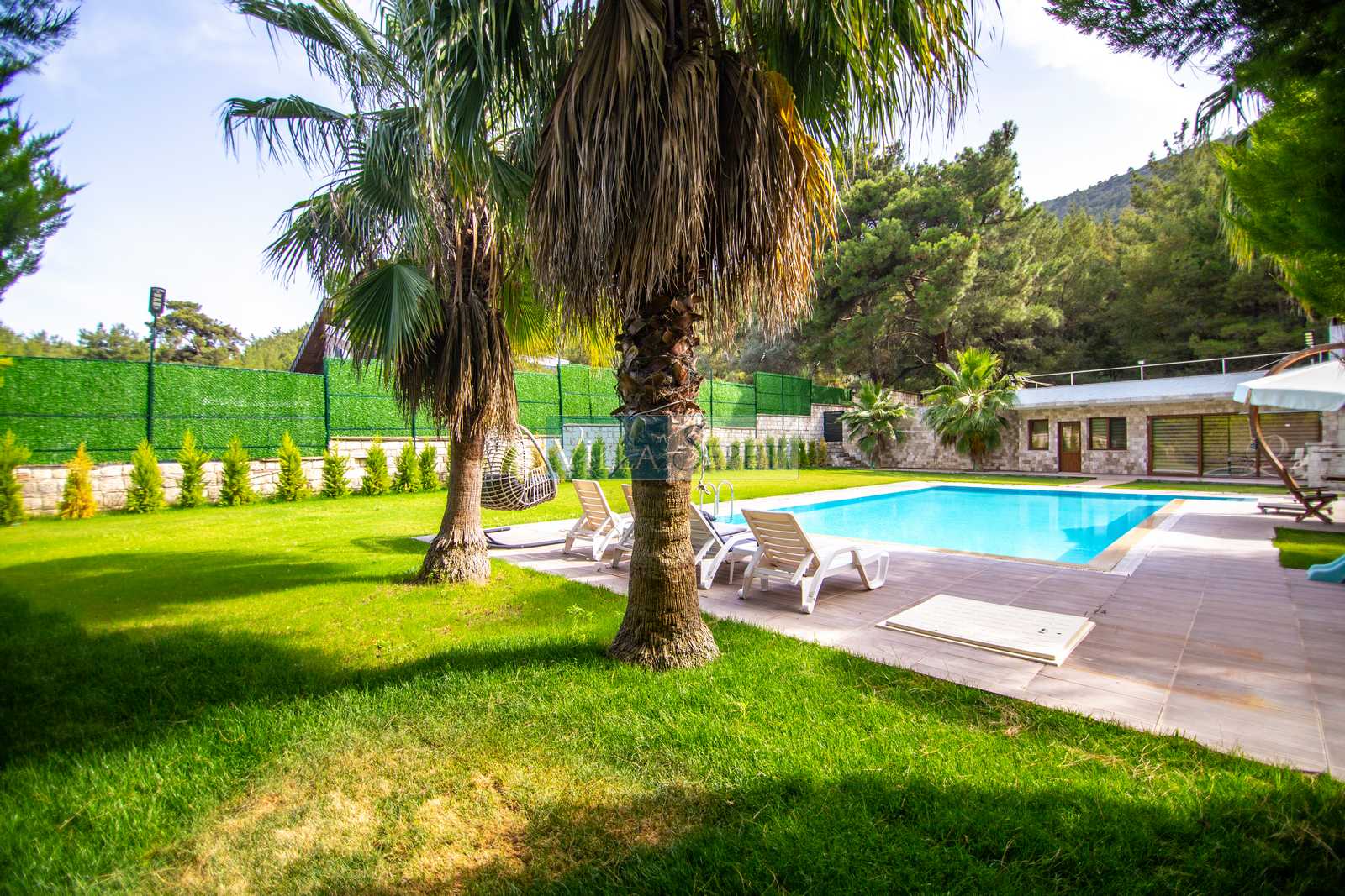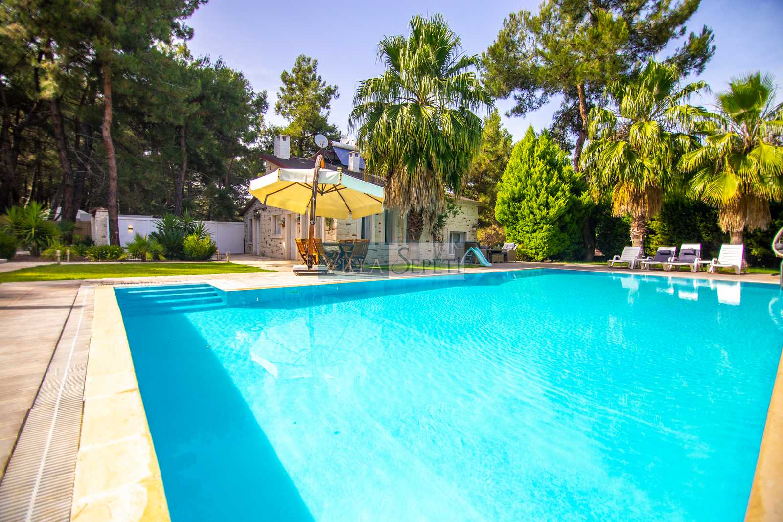 Bu evimiz bir site içerisinde yer almaktadır ve sitenin en üst mevkiinde çok özel bir konuma sahiptir. Çam ağaçları ile kaplı, 3700 m2 araziye sahip olan villamızın oldukça geniş, 12m. x 6m. büyüklüğünde müstakil yüzme havuzu bulunmaktadır.