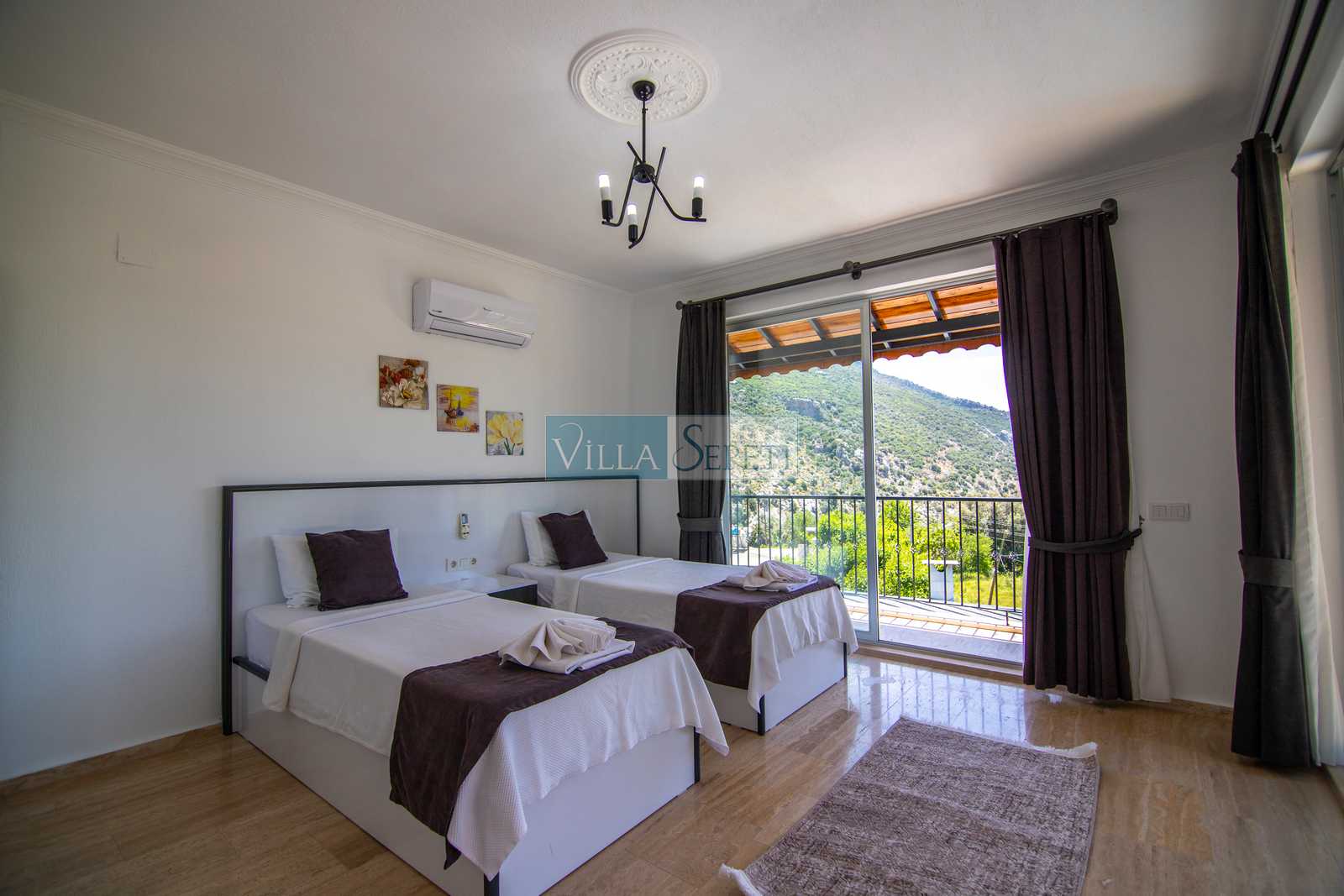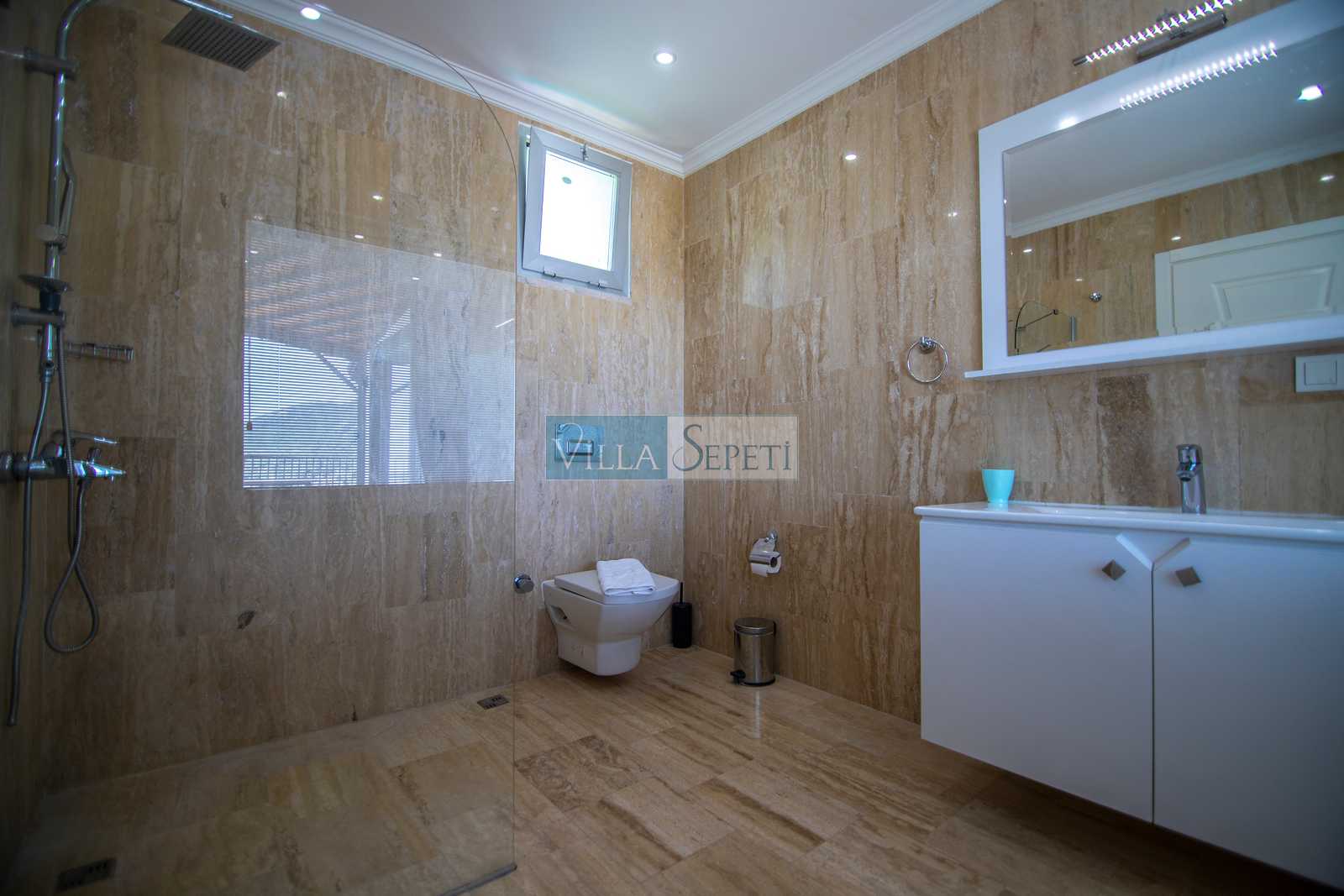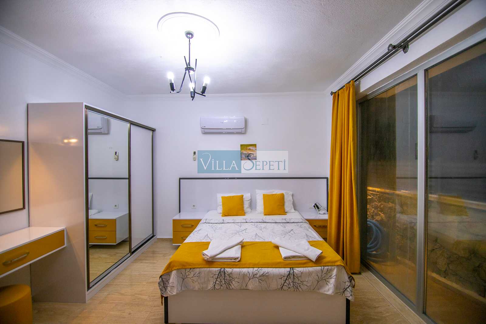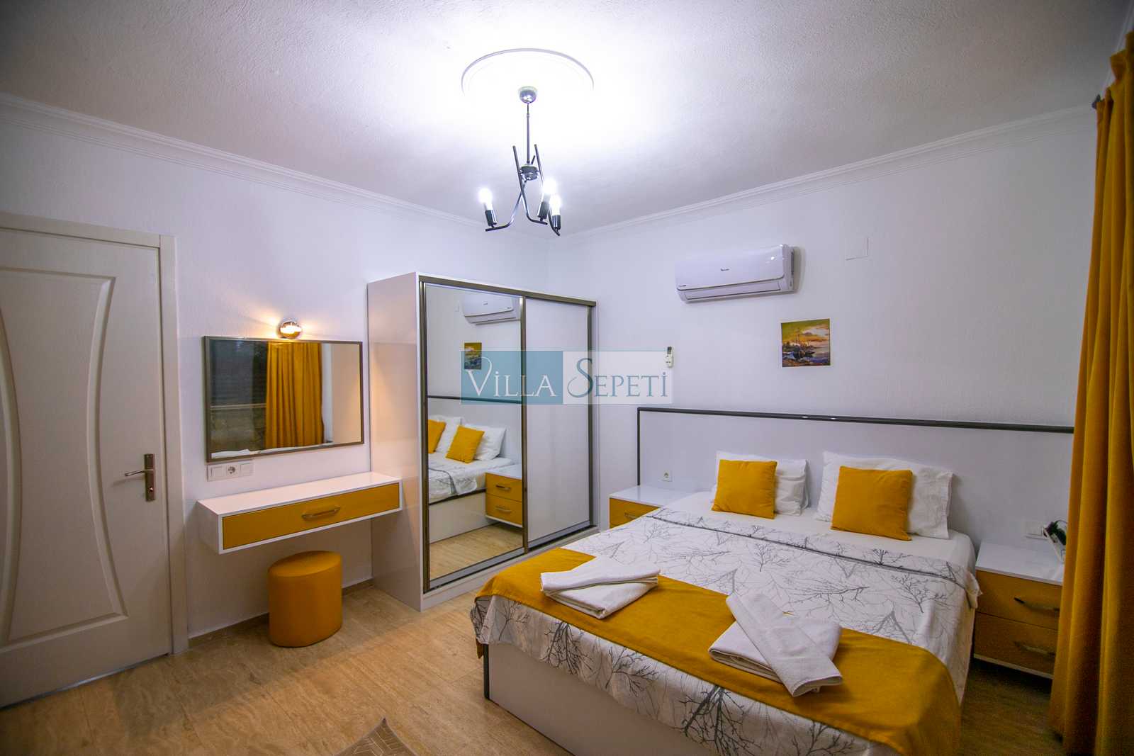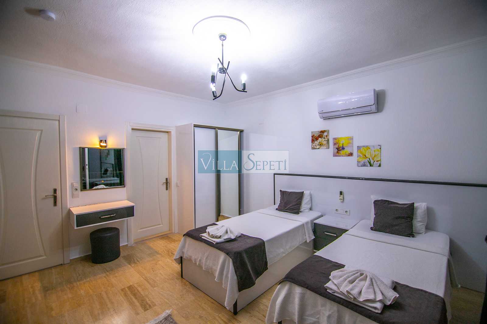 Villamız iki kattan oluşmaktadır, içerisinde üç adet yatak odası ve üç adet banyo bulunmaktadır. Birinci yatak odası içerisinde iki adet tek kişilik yatak, ebeveyn banyosu ve klima bulunmaktadır. İkinci yatak odası içerisinde çift kişilik yatak, ve klima ve bulunmaktadır. Üçüncü yatak odası içerisinde çift kişilik yatak, klima, banyo ve jakuzi bulunmaktadır bu odamız 1.katta yer almaktadır. Salon kısmında mutfak, klima, televizyon ve banyo bulunmaktadır.